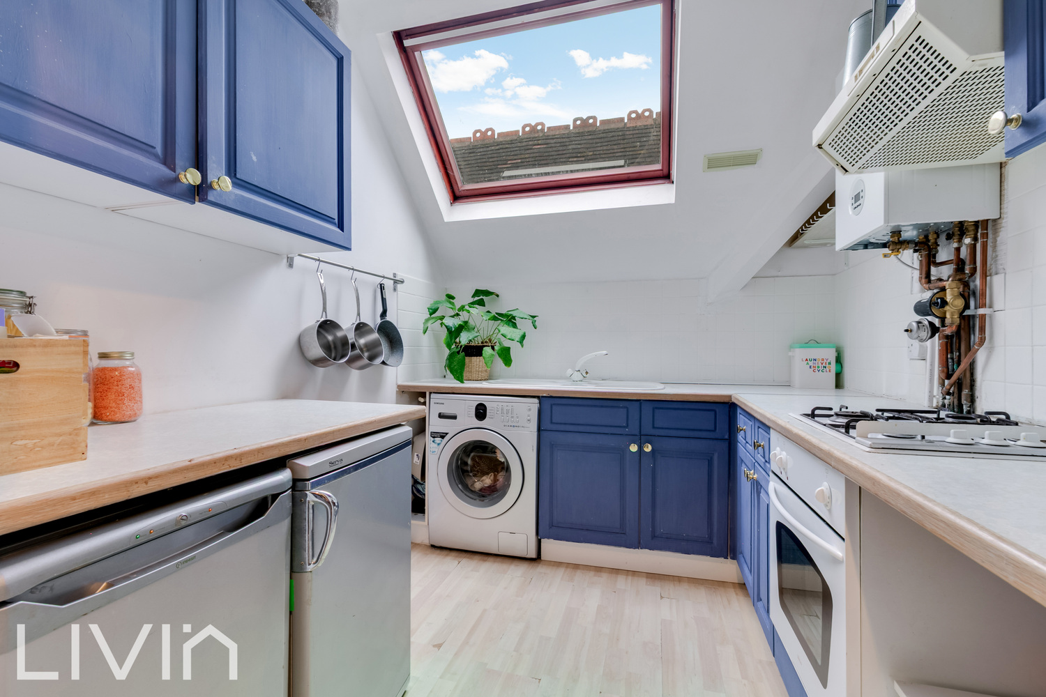 Just off the living space, the kitchen is thoughtfully arranged and full of light thanks to a large roof window. It offers good worktop space and storage, with room for everyday appliances, making it a practical space for cooking without compromising on style.