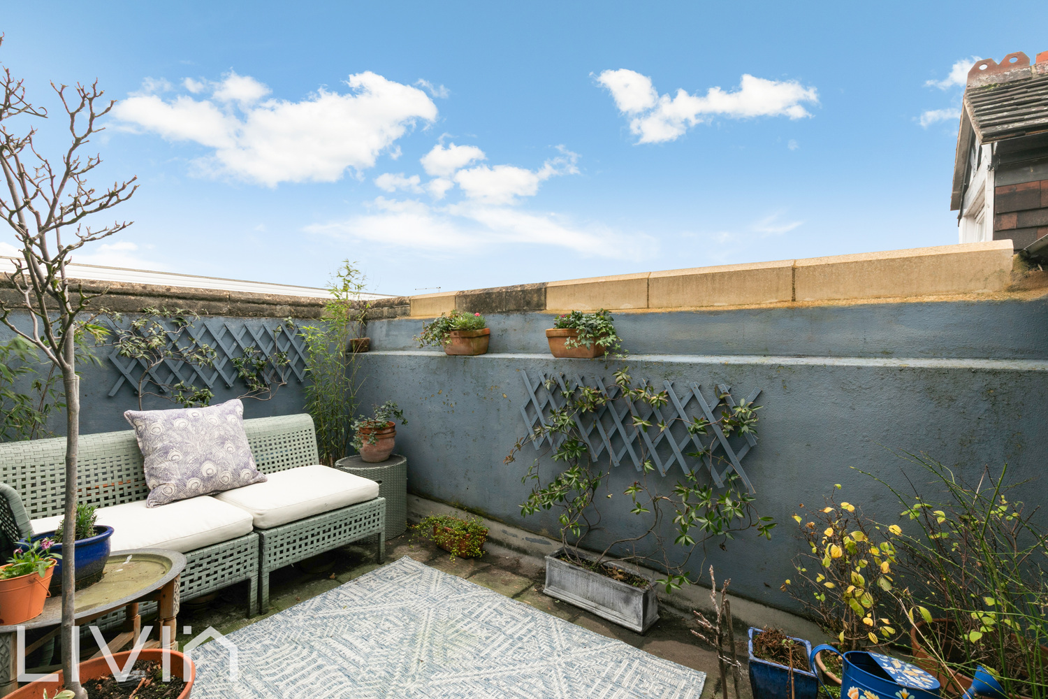 The bedroom is a comfortable double and benefits from a restful ambience, with access out to the private terrace—ideal for morning coffee, a few potted plants, or winding down on a summer evening. Completing the layout is a clean, modern bathroom with a bath and shower over, finished in smart, neutral tiling.