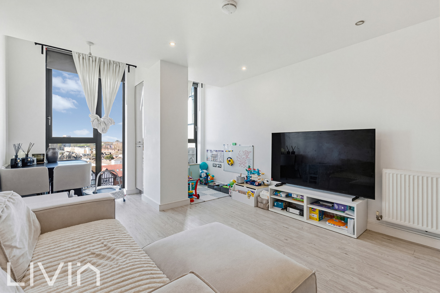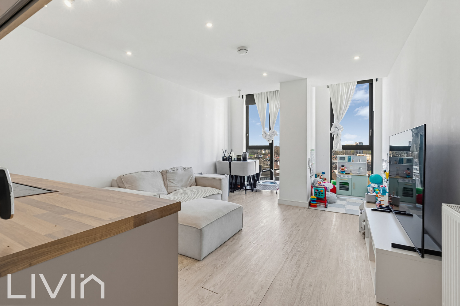 The heart of the home is a spacious reception room seamlessly combined with a sleek, well-appointed kitchen, creating an ideal space for both relaxing and entertaining. Large windows flood the room with natural light while framing attractive skyline views, enhancing the sense of space and airiness throughout. The neutral décor and wood-style flooring provide a clean, modern finish ready for a buyer to personalise.