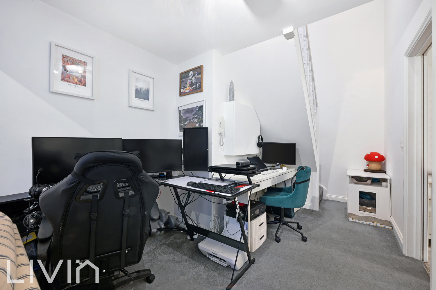 On the lower level, the generous reception room offers plenty of space to zone for relaxing, dining and working from home. High ceilings and a large sash window bring in great natural light, while the clean white décor is lifted by subtle pops of colour for a warm, inviting feel. There’s ample space for a full lounge set-up as well as desks or hobby areas, making it a genuinely practical everyday living space.