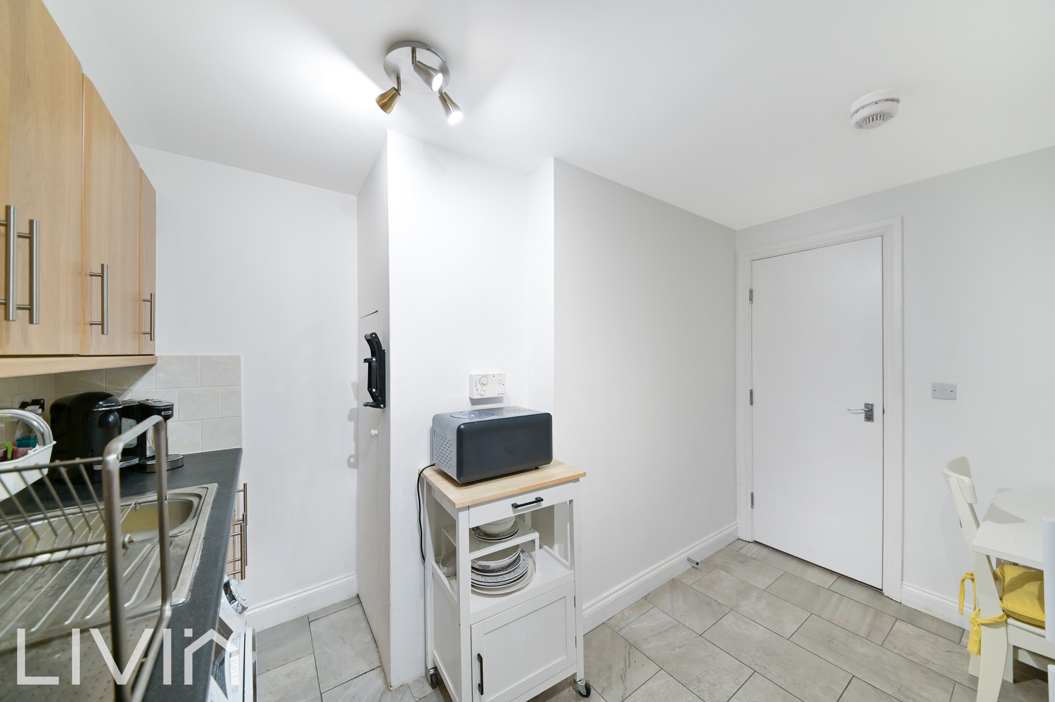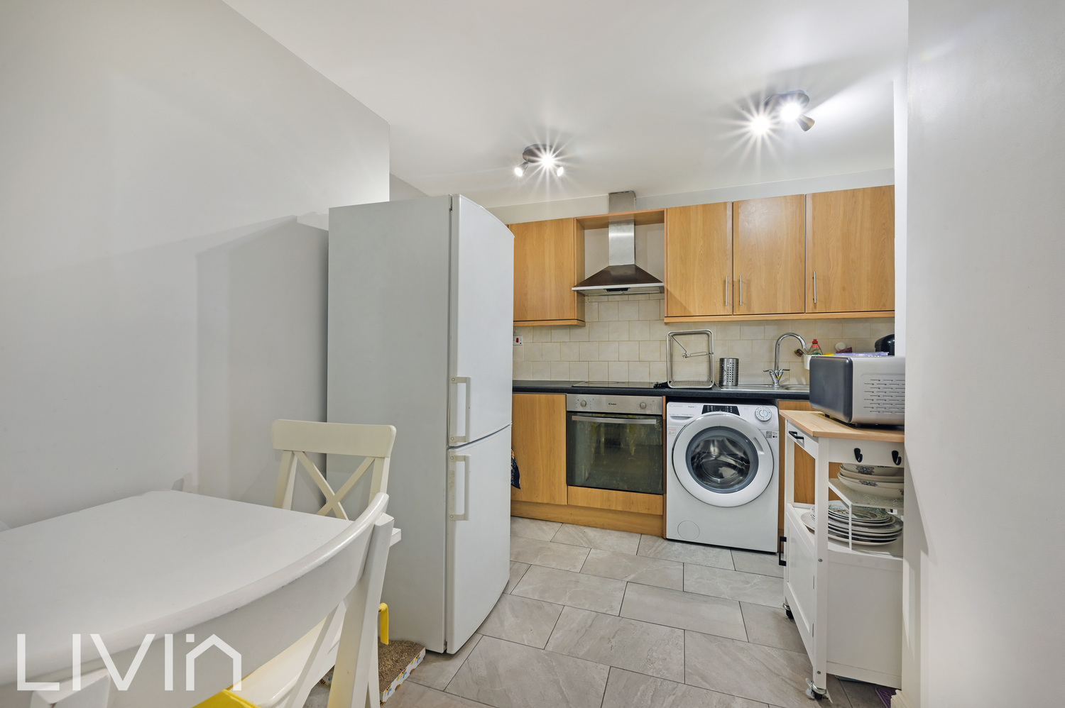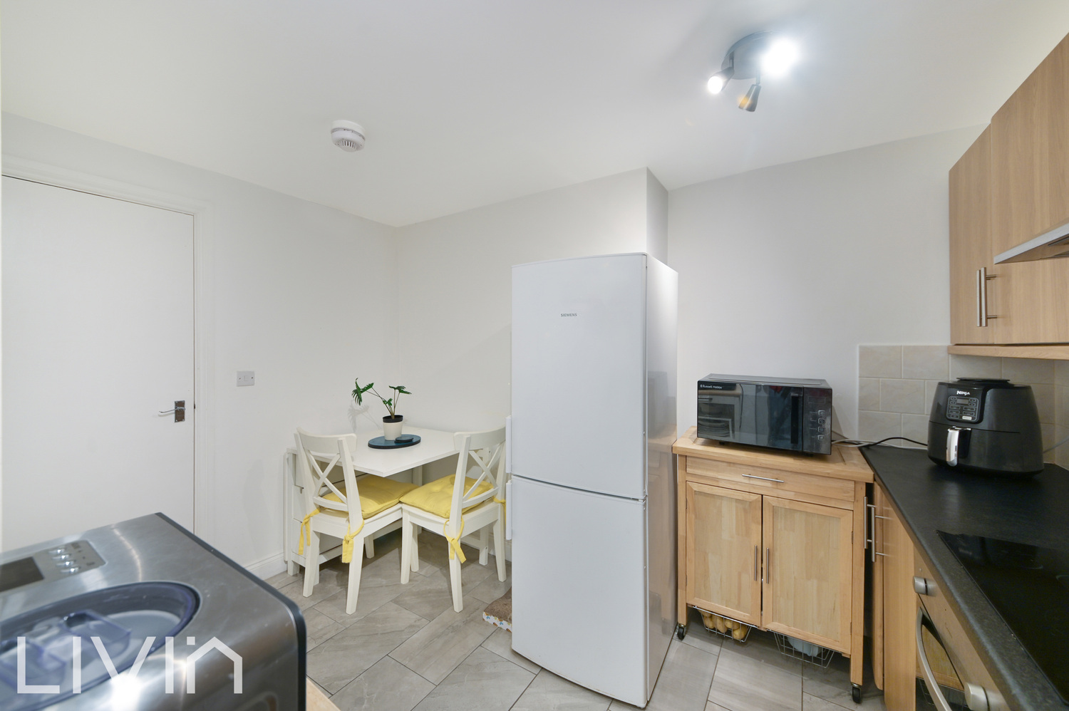 The separate kitchen features contemporary units and worktops, with space for all the usual appliances and a small dining table. It’s a bright, sociable room perfect for weeknight cooking or hosting friends at the weekend.