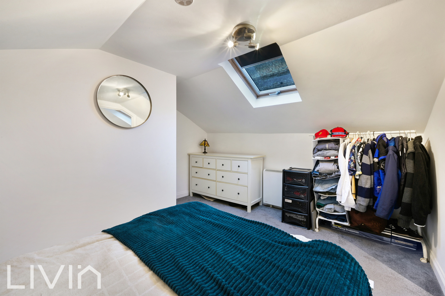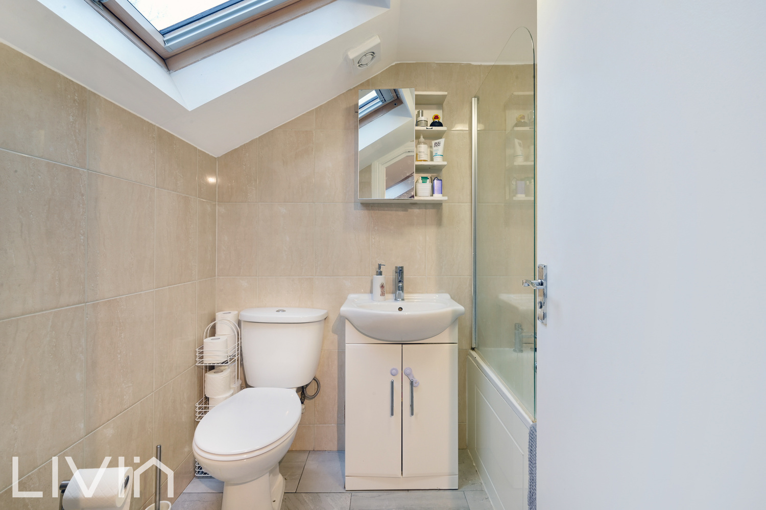 Upstairs, the tranquil double bedroom feels like a proper retreat, tucked into the eaves with a skylight and plenty of space for wardrobes and storage. The modern bathroom on the same level includes a bath with shower over, sleek tiling and a roof window that floods the room with natural light, giving it a fresh, boutique-hotel feel. Additional eaves storage ensures everything can be neatly stowed away.