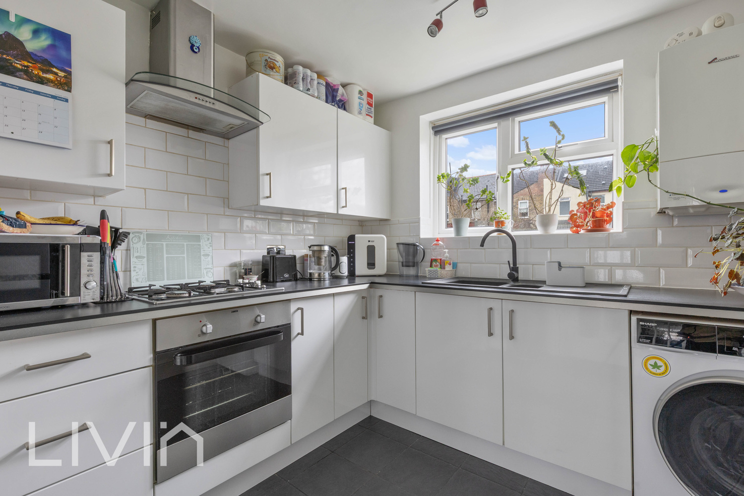 The kitchen is fitted with modern white units and ample worktop space, with room for appliances and everyday essentials. The bedroom is a generous double, presented in calming tones and offering excellent flexibility for wardrobes and additional furniture.