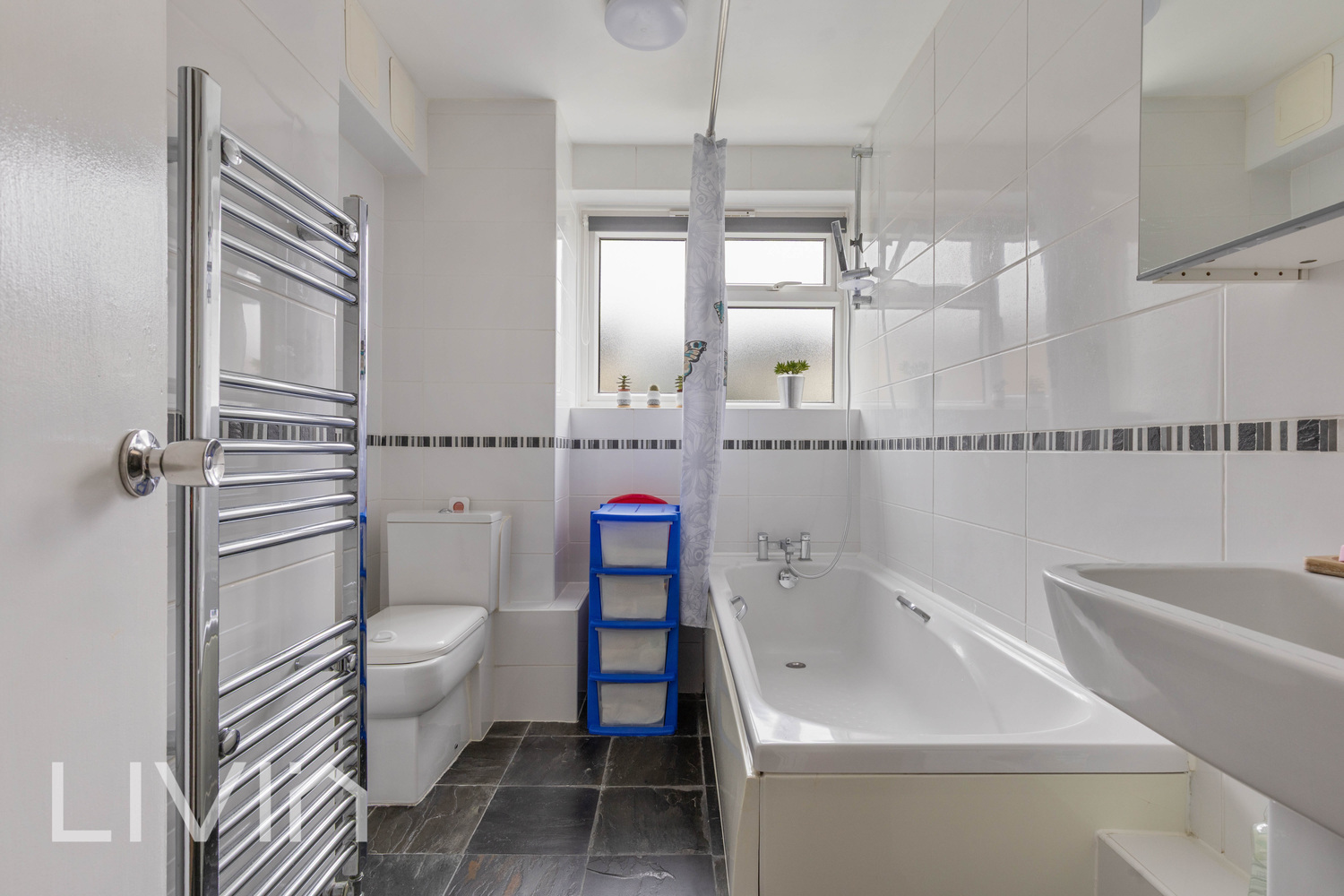Completing the home is a clean, tiled bathroom with a full-sized bath and shower over, alongside a useful hallway layout that keeps the living space feeling separate and well organised.