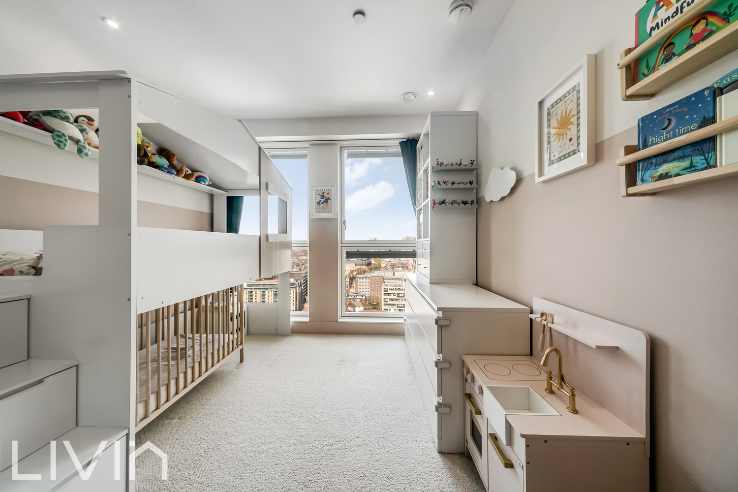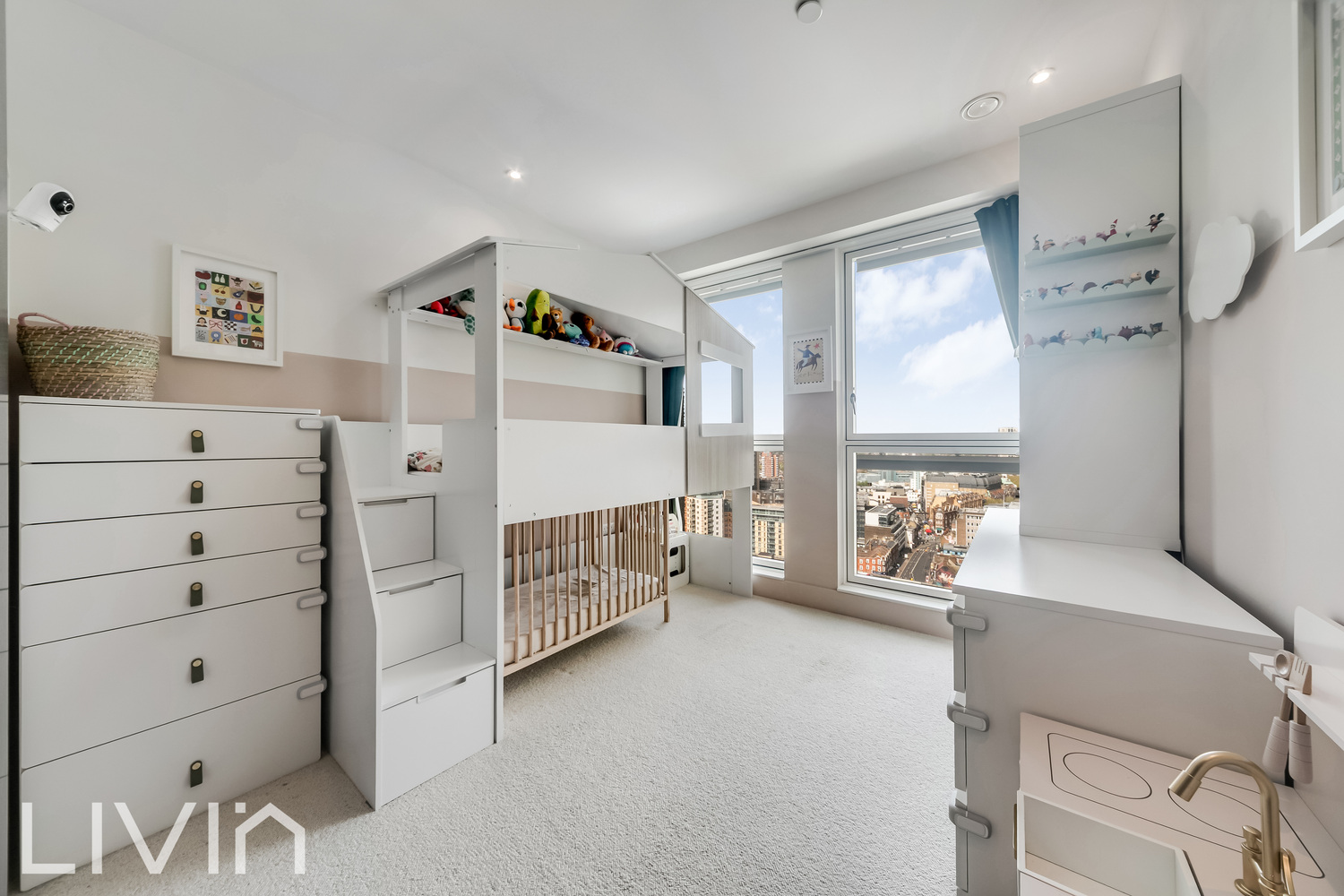 The heart of the home is a stunning open-plan reception space, thoughtfully designed to combine living, dining and kitchen areas seamlessly. Floor-to-ceiling windows flood the room with light while framing impressive skyline views, creating a bright and inviting atmosphere. The modern kitchen is finished to a high standard with sleek cabinetry, integrated appliances and a central island that doubles as both a practical workspace and a sociable focal point—perfect for entertaining or everyday living.