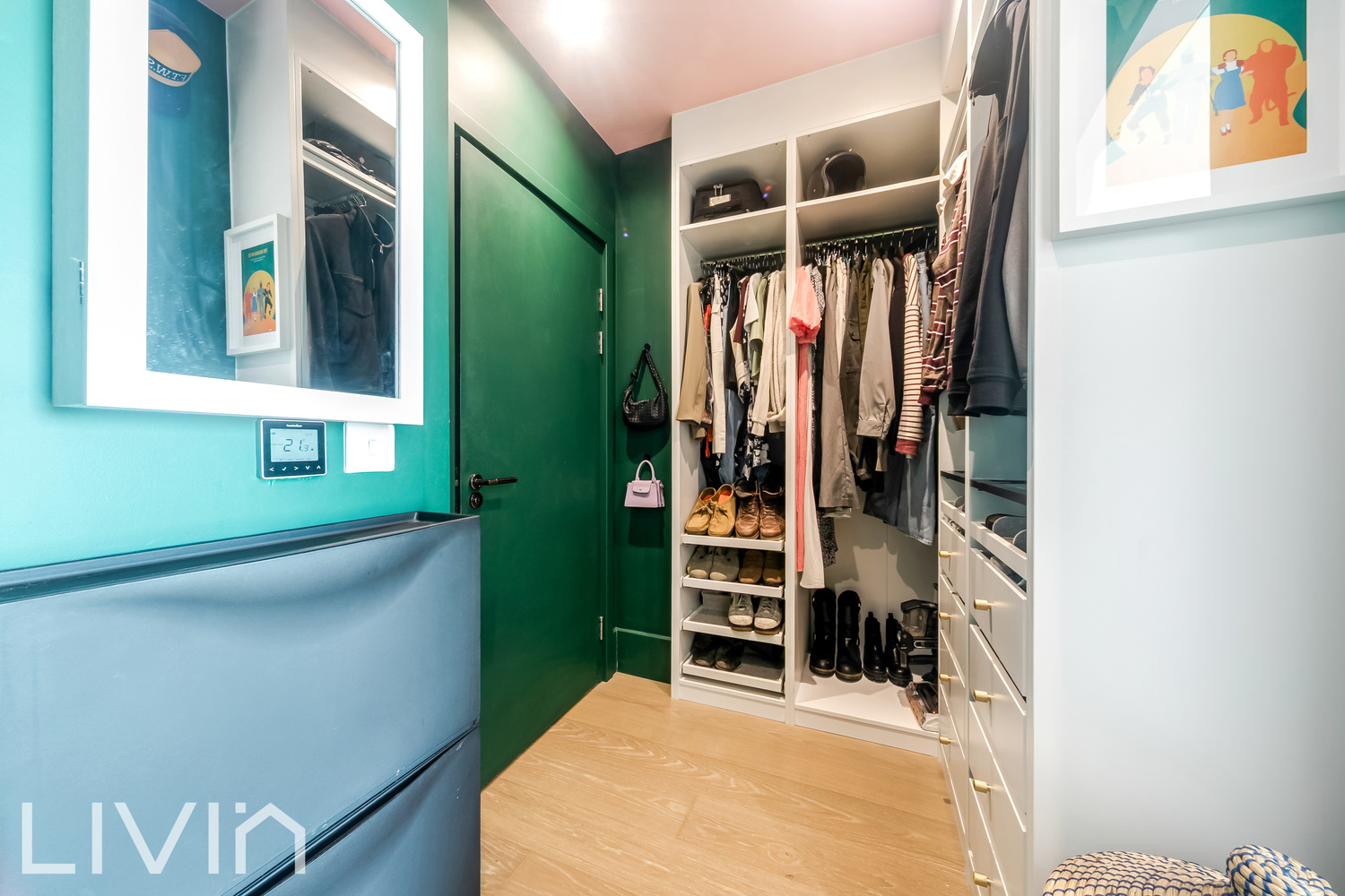 The bedroom is well-proportioned and continues the theme of light and comfort, complemented by a separate dressing area that provides excellent built-in storage and a sense of luxury. The bathroom is contemporary in style, featuring clean lines and quality fittings, while an additional utility/storage space adds to the apartment’s practicality.
