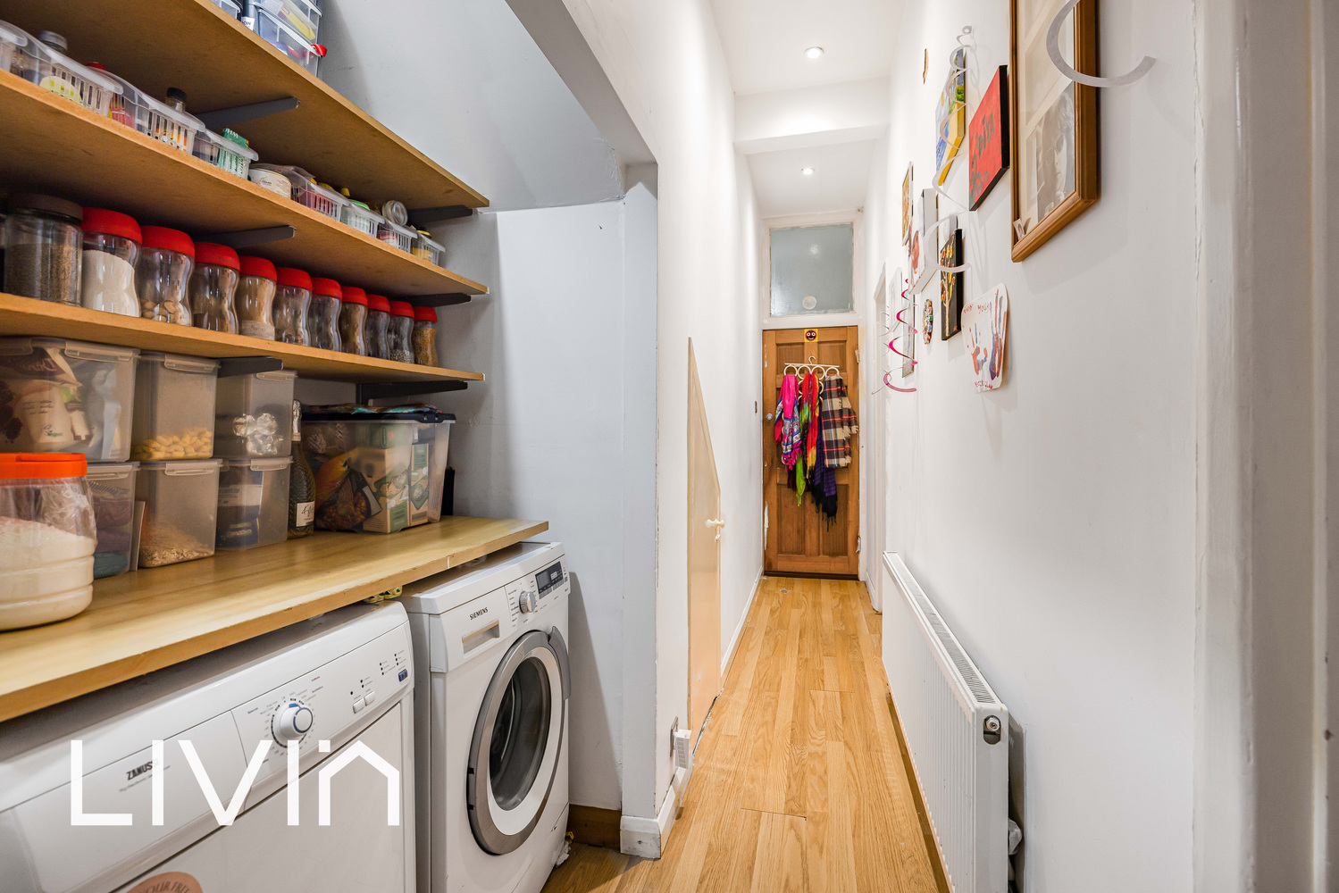 Additional storage is available within the hallway area, which also provides space for laundry appliances and shelving, helping to keep the main living areas uncluttered.