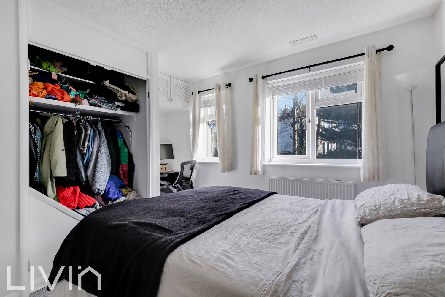 Upstairs, the bedroom is a calm and inviting space with excellent natural light and useful built-in storage, with room to include a desk area for home working if required. The bathroom is bright and neatly finished, featuring a bath with shower over, modern sanitaryware and a heated towel rail.