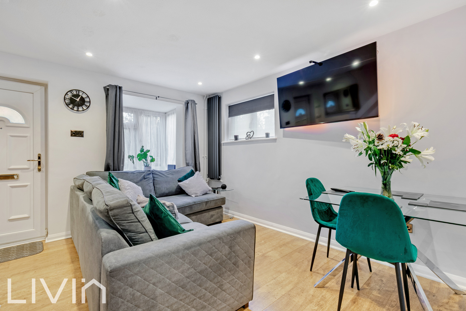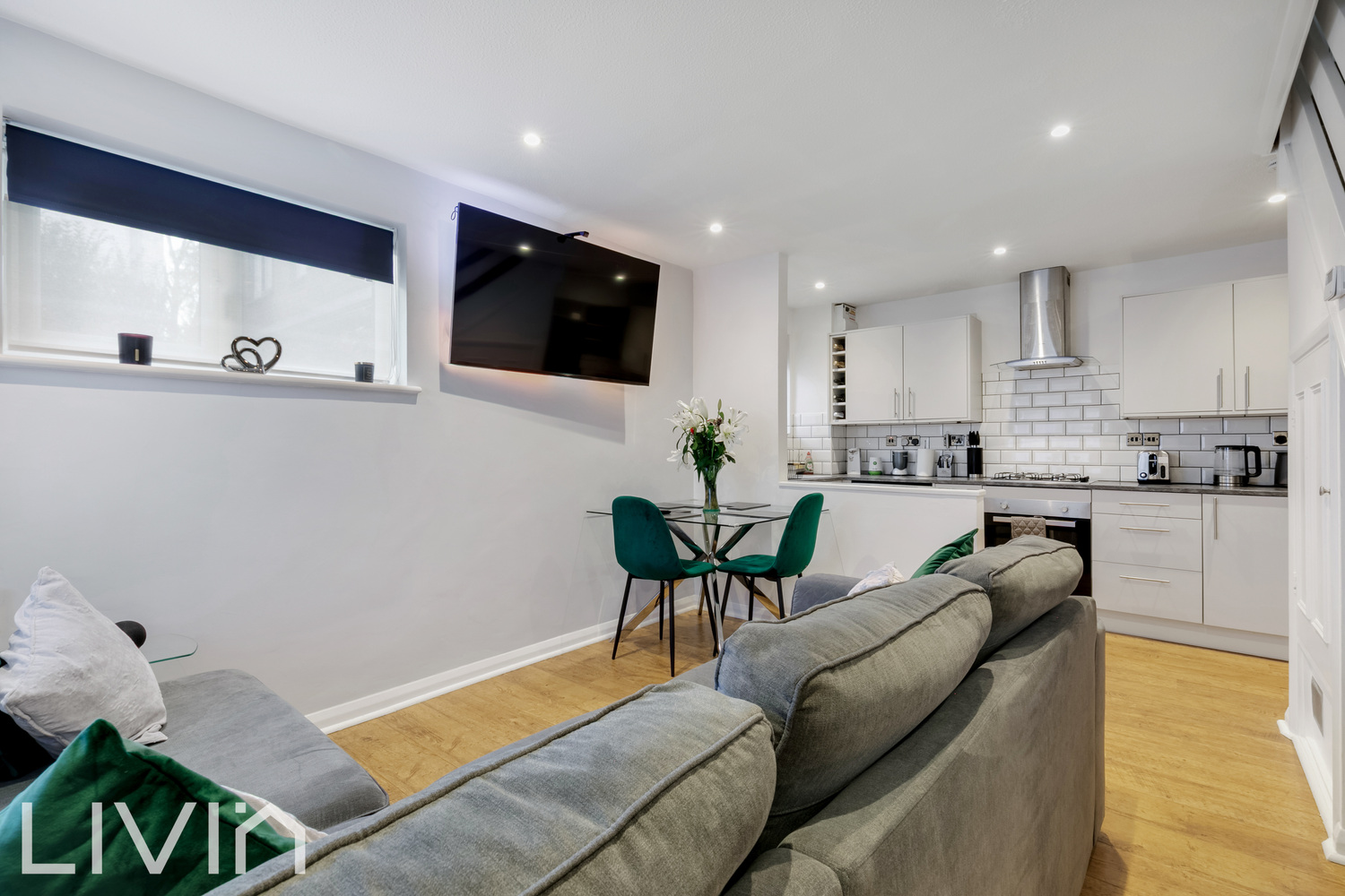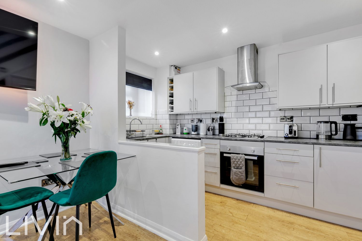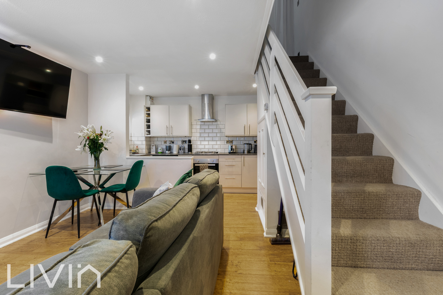 The ground floor is centred around an open-plan reception space that comfortably accommodates both lounge and dining areas, finished with contemporary flooring and sleek recessed lighting. The modern fitted kitchen sits neatly to one side, featuring clean-lined cabinetry, quality worktops and smart tiled splashbacks, creating a practical and sociable layout for everyday living and entertaining.