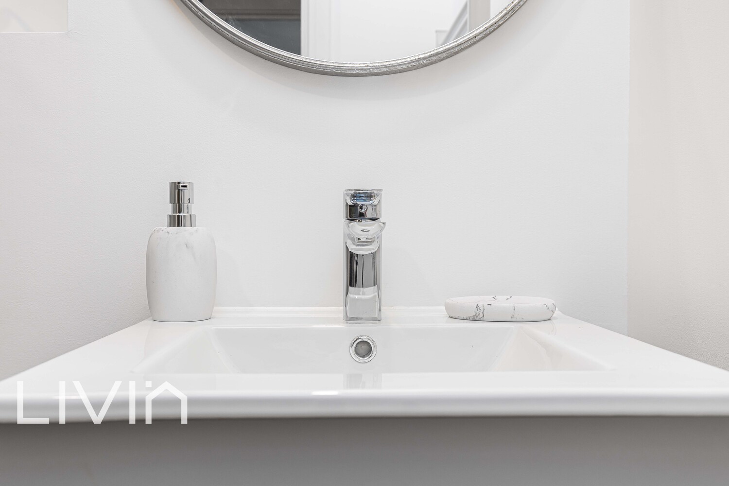 The sleek, fully equipped kitchen combines practicality with style, flowing seamlessly into the living space. The thoughtfully designed layout also offers access to a private patio garden and a balcony, ideal for enjoying outdoor moments in comfort.