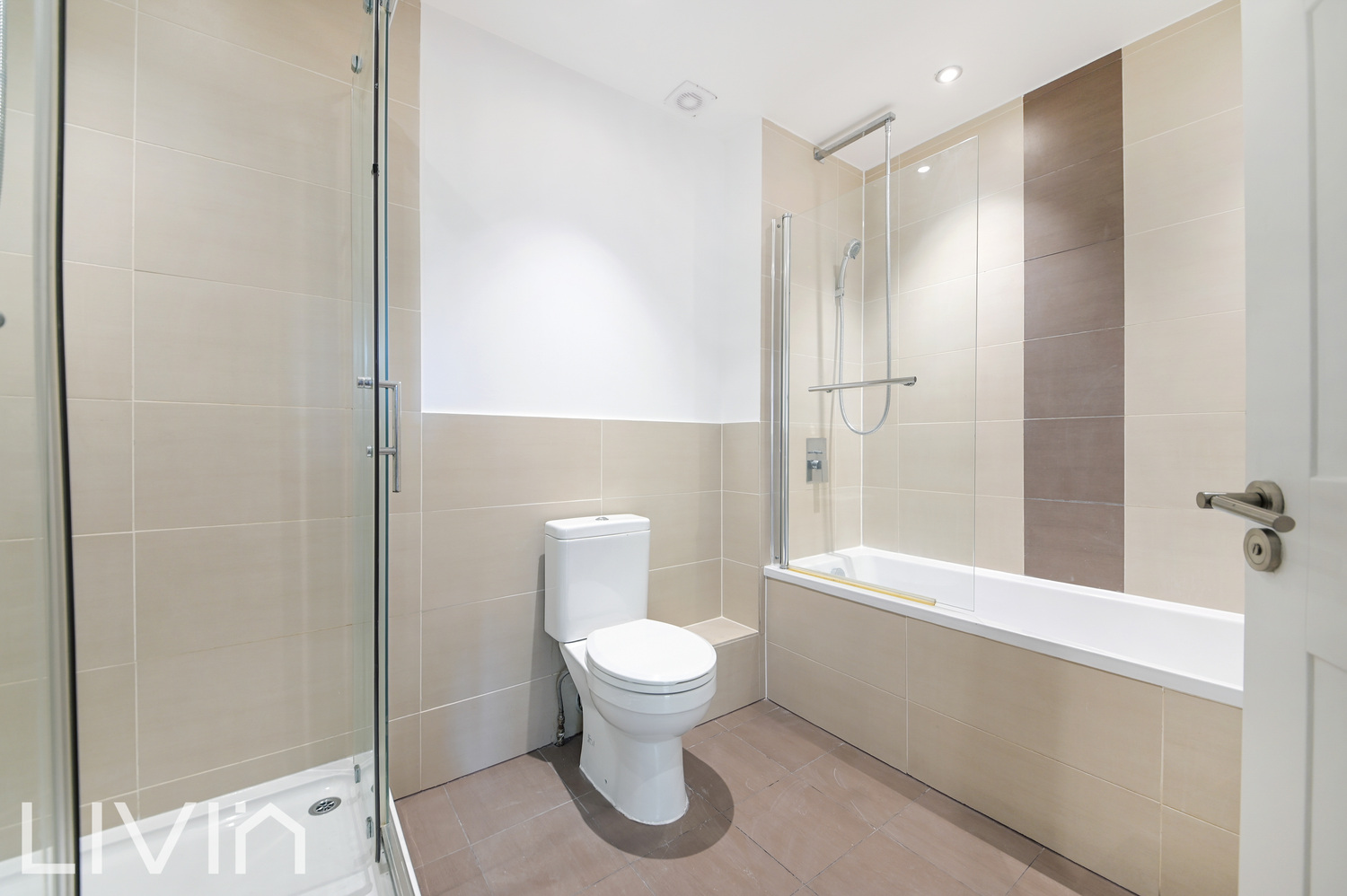 The bathroom is stylishly finished, complete with both a bathtub and a separate shower, providing convenience and comfort. Neutral décor throughout enhances the natural light, creating a warm and inviting atmosphere.