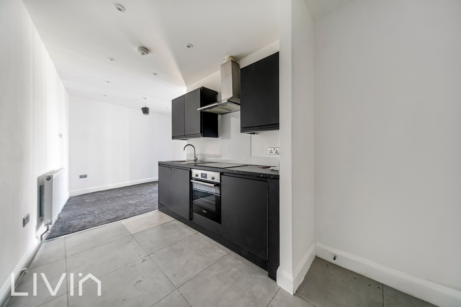 The property opens into a welcoming hallway leading through to a spacious open-plan reception room and kitchen, designed with modern living in mind. The living area is flooded with natural light from large windows and direct access to a private balcony, creating an ideal space for both relaxing and entertaining. The kitchen is sleek and contemporary, featuring integrated appliances, ample storage, and a clean, minimalist finish.