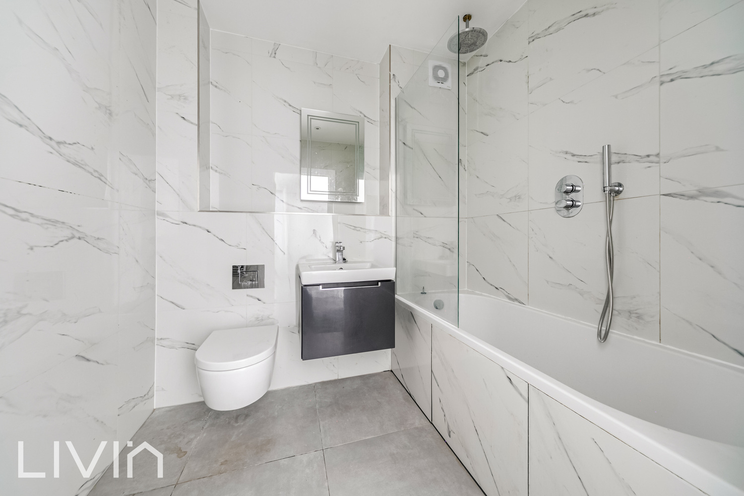 The bathroom is finished to a high standard with modern fittings, including a full-sized bath with shower, stylish tiling, and a contemporary vanity unit.