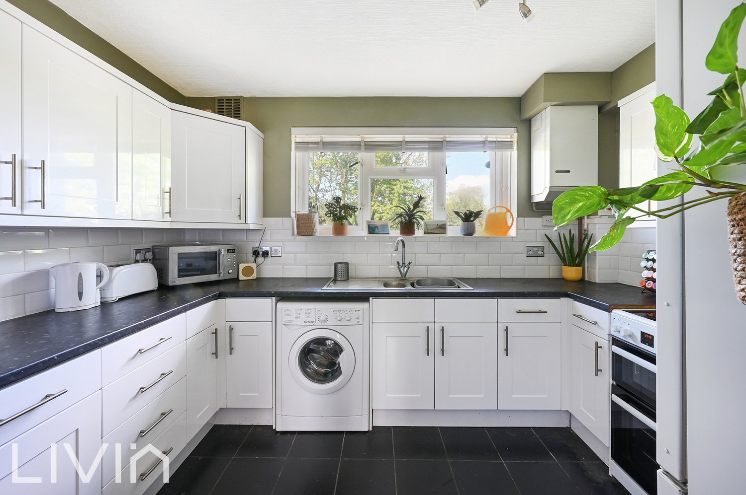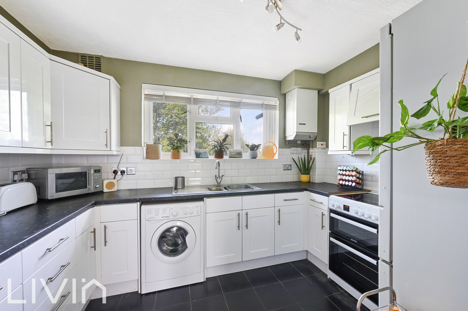 The separate kitchen is well laid out with a range of fitted units and worktop space, complemented by a large window that floods the room with light and provides an attractive leafy view. The layout is both functional and spacious, making it a pleasant environment for everyday cooking.