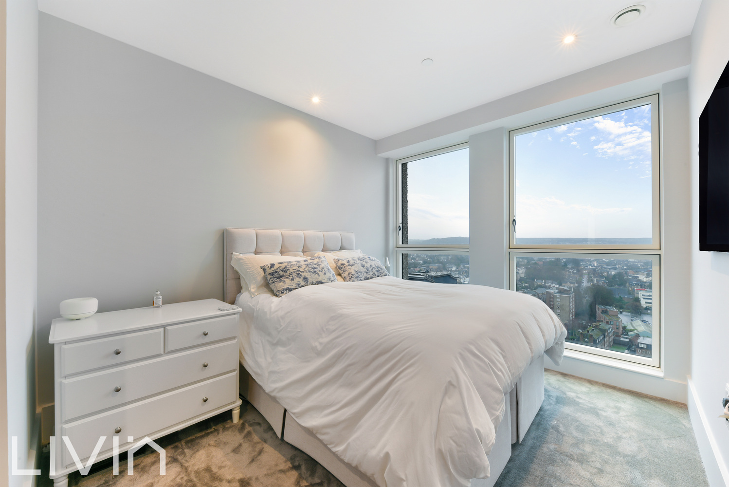 Upon arrival, you are welcomed into a light-filled sanctuary featuring an expansive open-plan kitchen and living area, enhanced by large, south-facing windows. Positioned high above the surrounding area, these windows not only flood the space with natural light but also frame stunning panoramic views, creating an impressive backdrop to everyday living. The south-facing aspect also contributes to excellent heat retention, keeping the flat warm and inviting, even during the winter months.