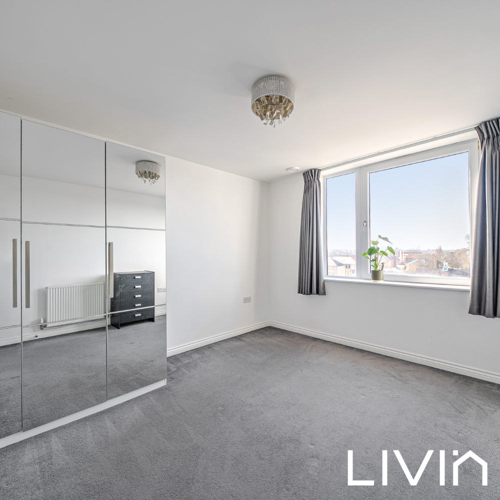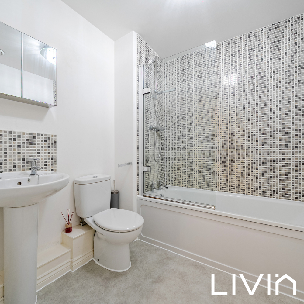 There are two well-proportioned double bedrooms, both presented in neutral tones and offering a calm, airy feel. The principal bedroom benefits from fitted wardrobes and its own en suite shower room, while the second bedroom is ideal as a guest room, child’s room or home office. A modern family bathroom serves the rest of the apartment and is finished in a clean, simple style.