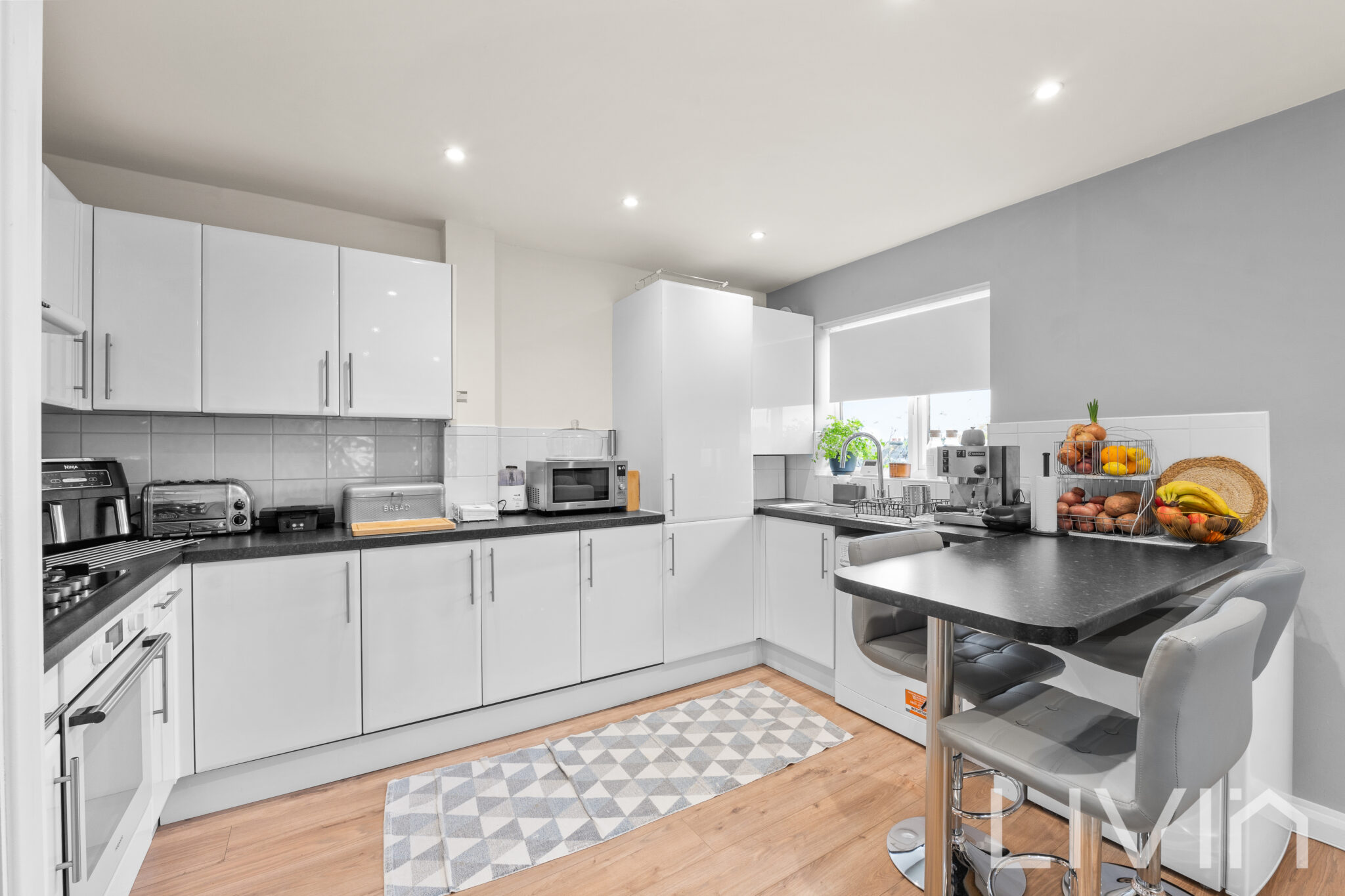 The accommodation comprises an entrance hall with integrated storage, leading seamlessly into the airy reception/kitchen space. Additionally, there are two generously sized double bedrooms and a stylish family bathroom adorned with elegant tiling and a pristine white three-piece suite.