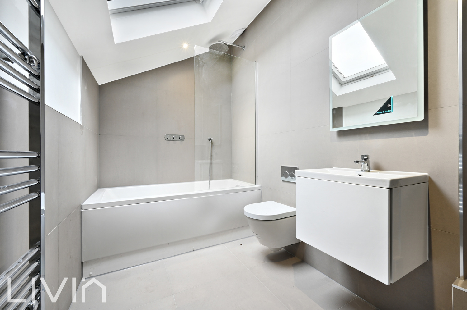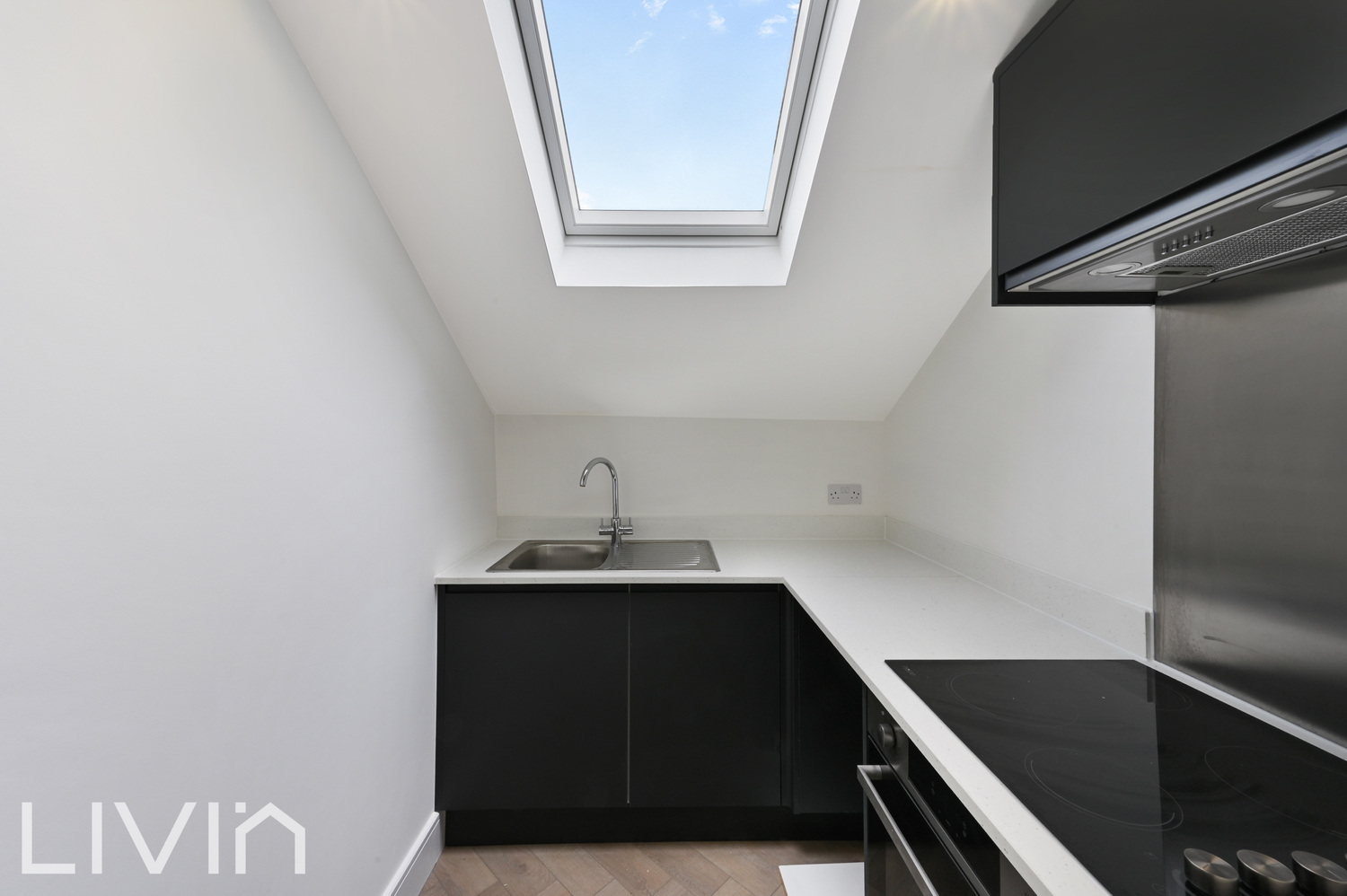 The property features a well-proportioned reception room, ideal for both relaxing and entertaining, with plenty of natural light enhancing the sense of space. The separate kitchen is sleek and modern, fitted with contemporary cabinetry, integrated appliances, and a skylight that floods the space with daylight.