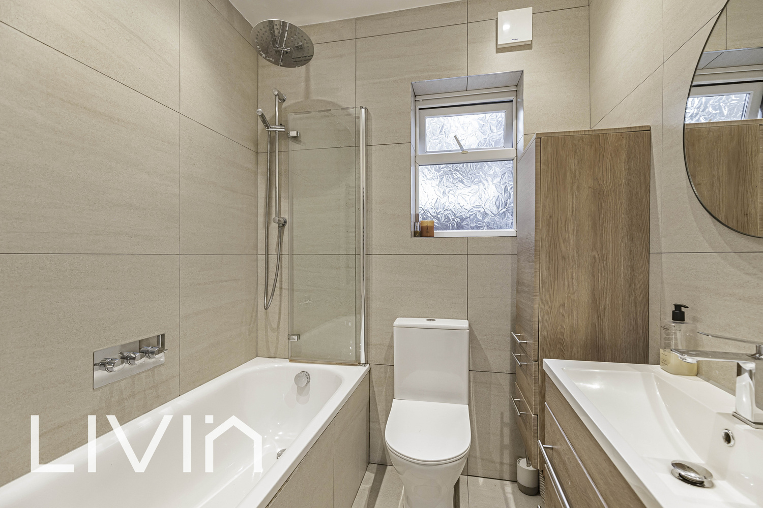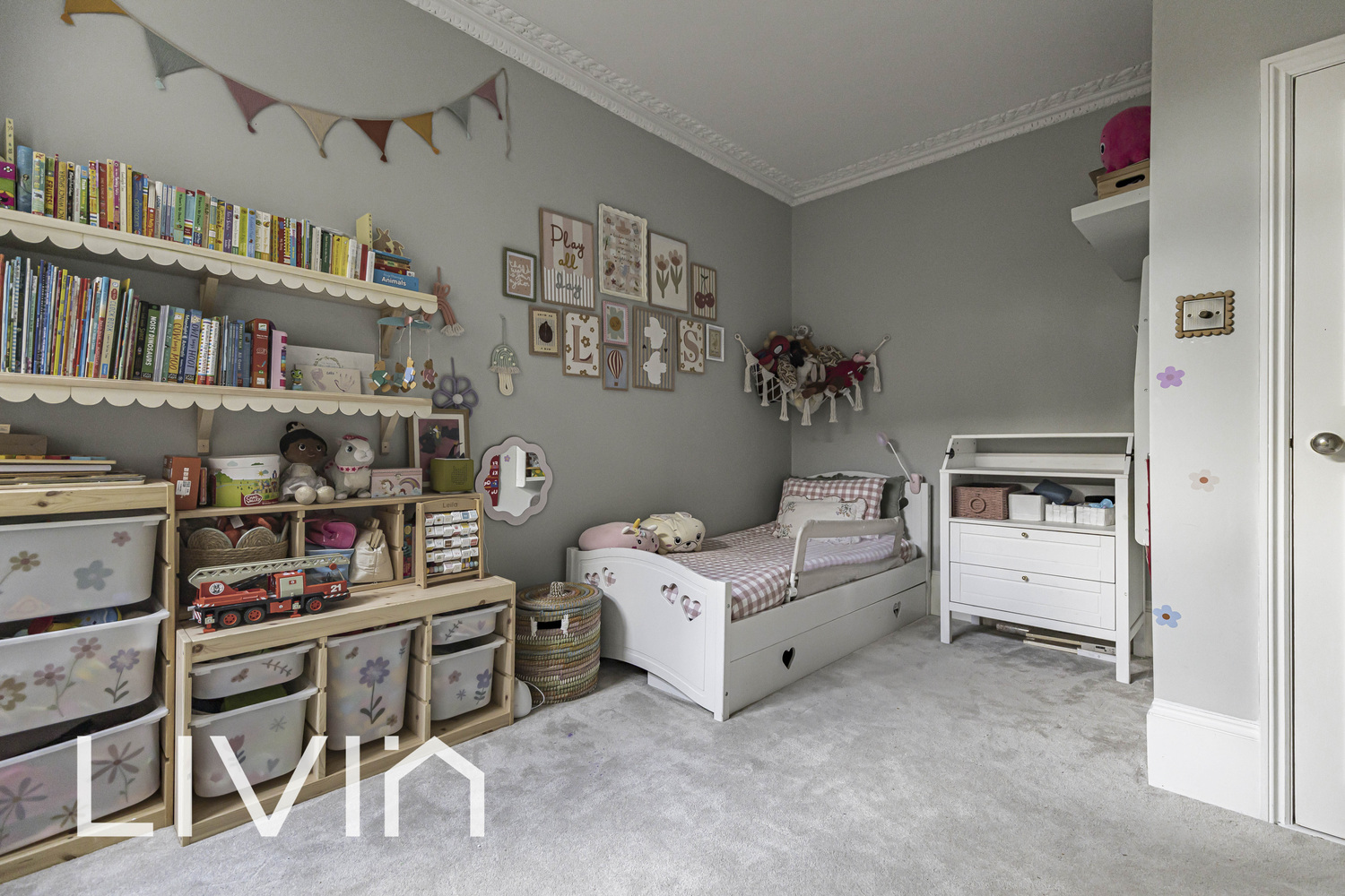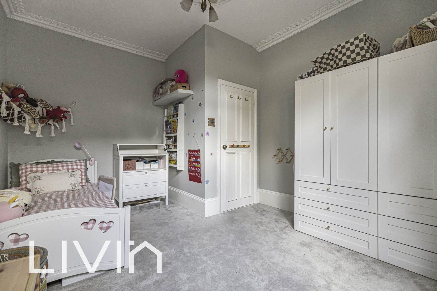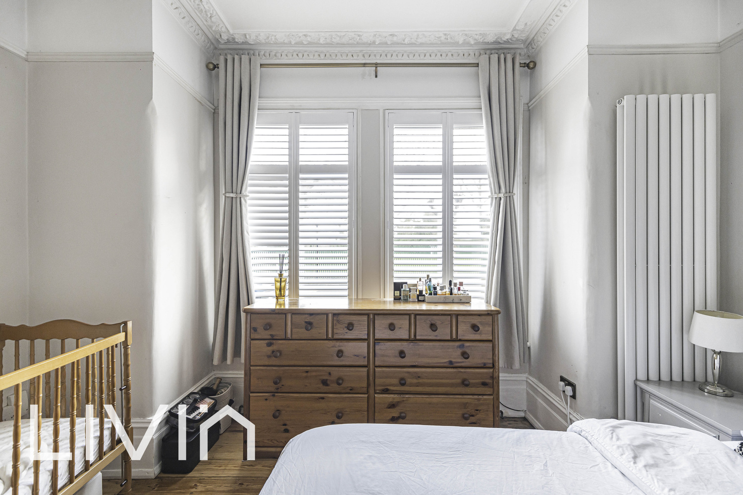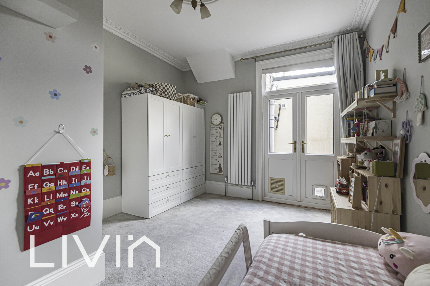 There are two generous double bedrooms, including a principal bedroom rich in period detail, and a second bedroom with direct garden access — ideal as a guest room, nursery or home office. A sleek, contemporary bathroom and a substantial basement providing utility space and additional storage complete the accommodation.