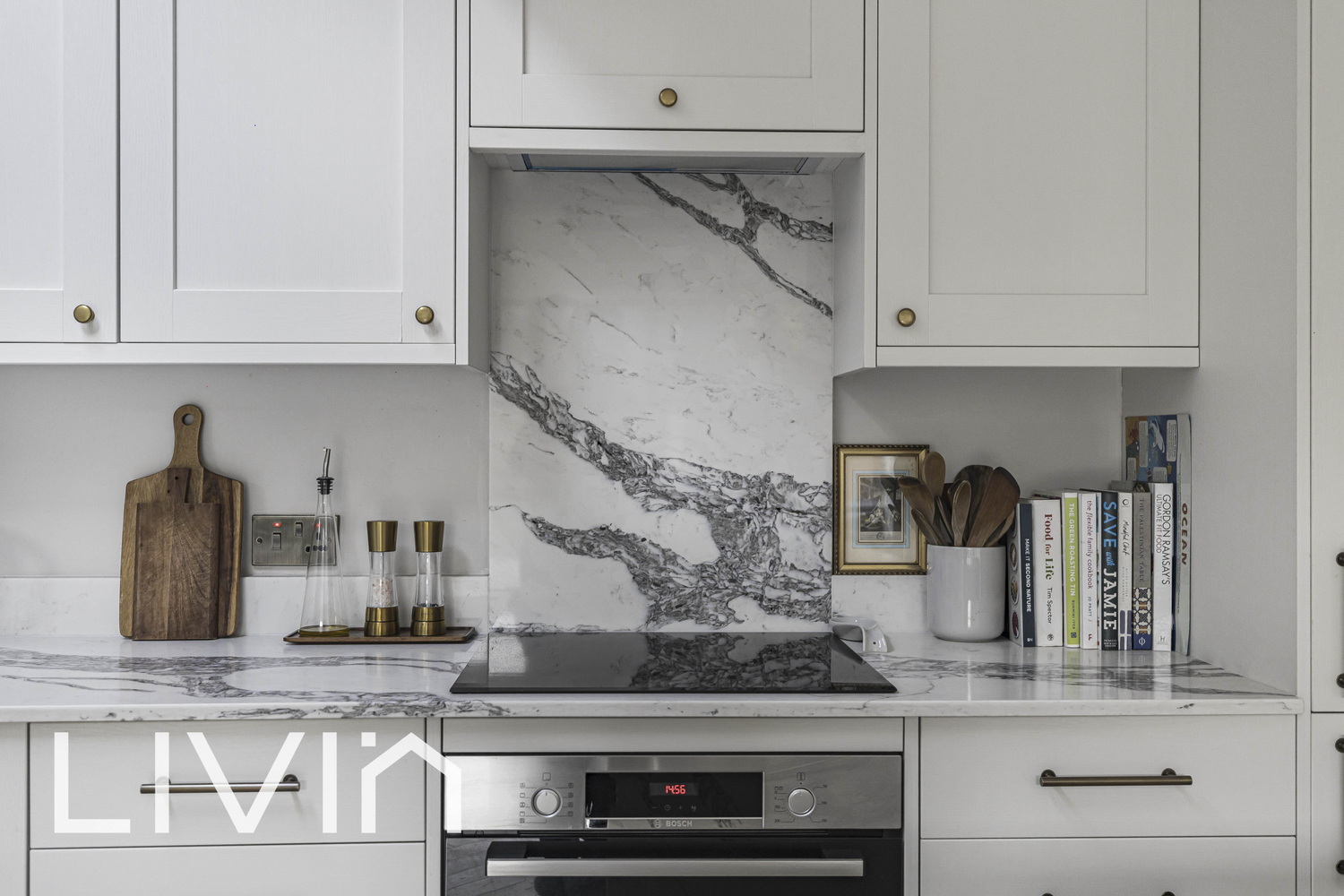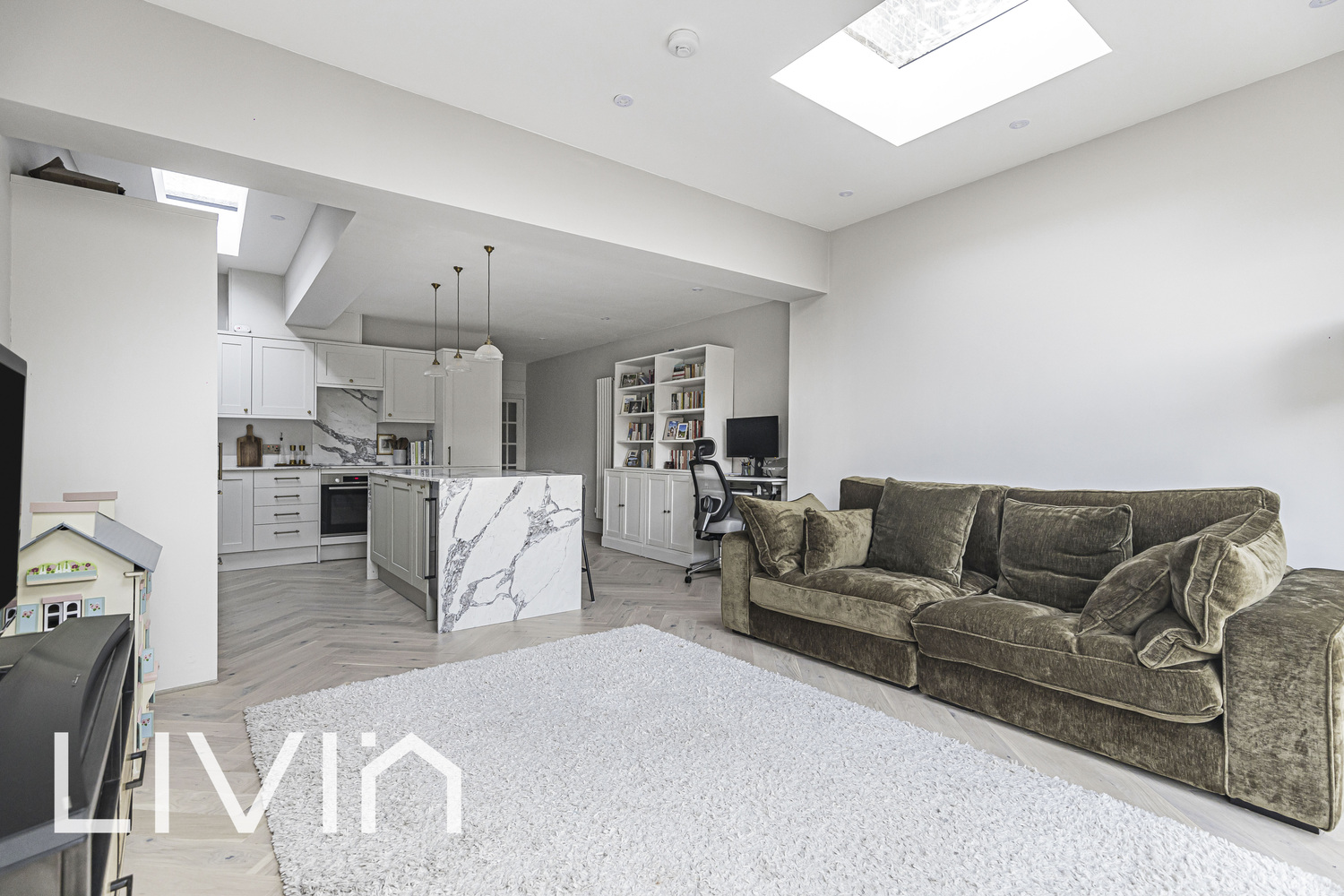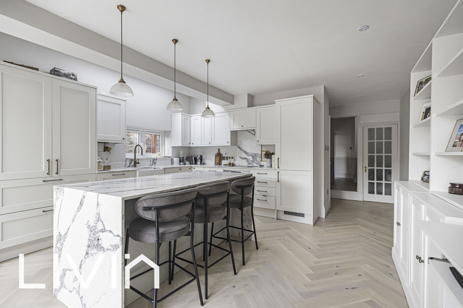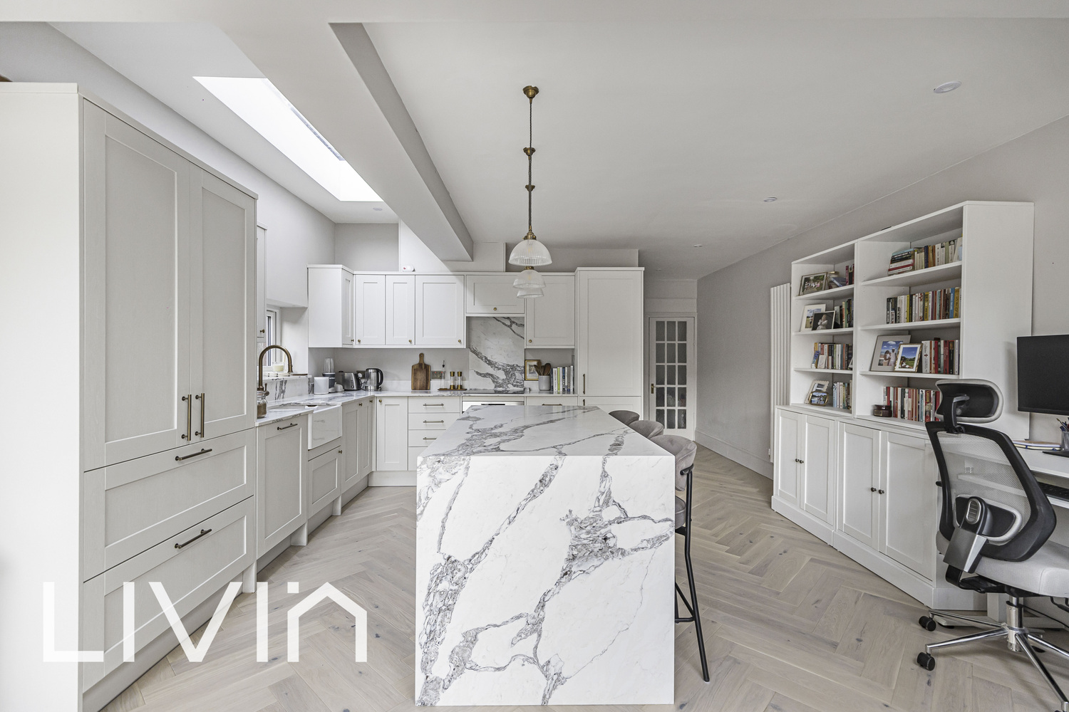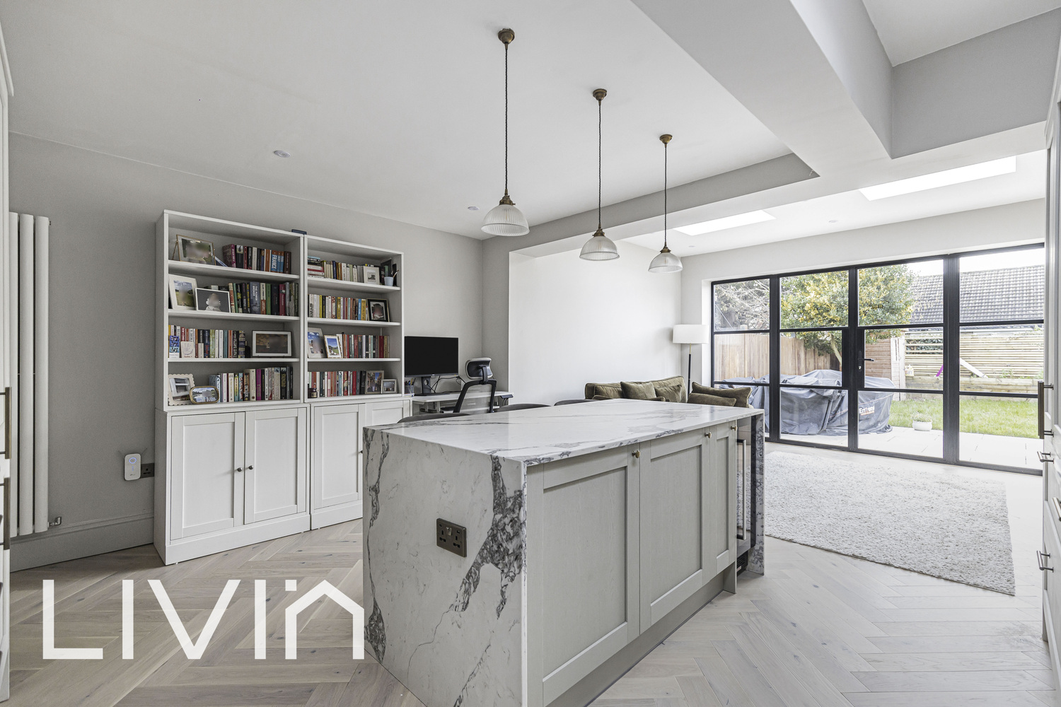 The standout feature is the impressive open-plan kitchen, dining and living space to the rear. Designed for modern living, it centres around a statement island and includes integrated Bosch appliances, a generous pantry and excellent storage. Rooflights and expansive glazing flood the space with natural light, while large doors open directly onto the garden — perfect for summer entertaining and effortless indoor-outdoor living.