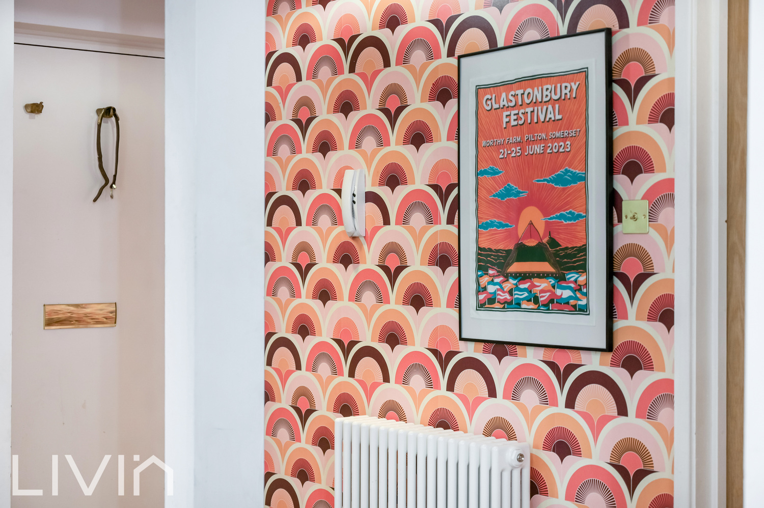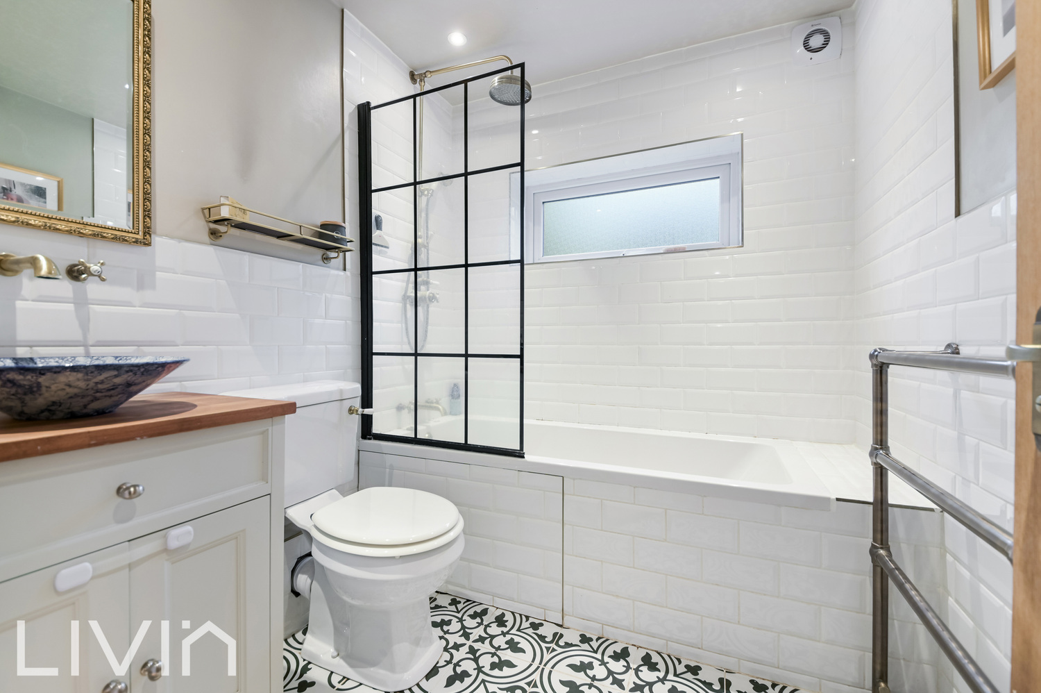 Both bedrooms are calm, well-proportioned doubles with bespoke touches and excellent storage potential, while the bathroom exudes boutique-hotel style with metro tiling, a black-framed shower screen, patterned floor tiles, and high-quality fittings.