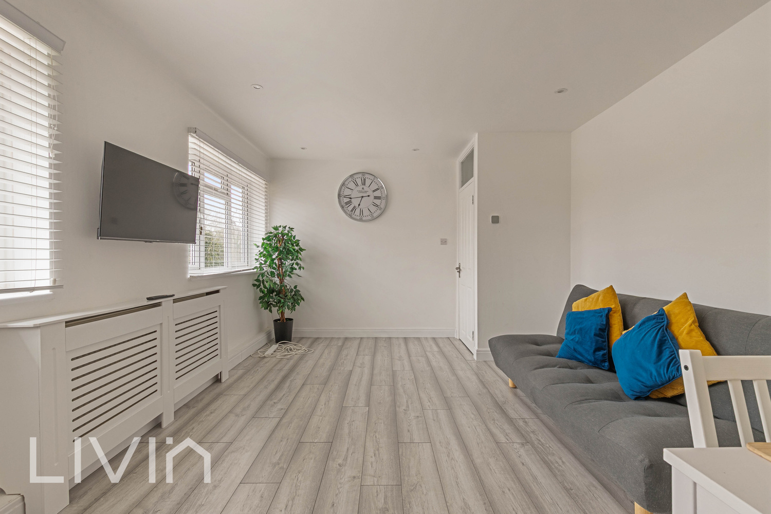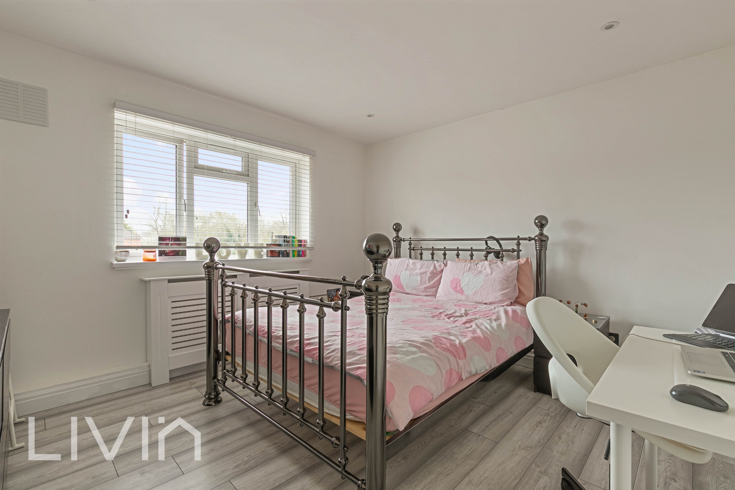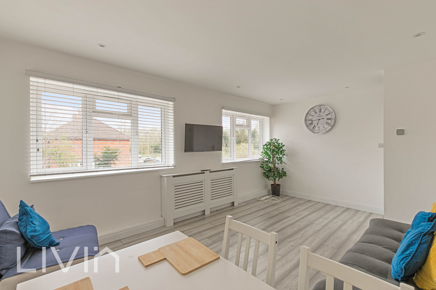 The heart of the home is the impressive reception room, a wonderfully light and airy space with dual aspect windows that flood the room with natural light. There is ample space for both relaxing and dining, creating a versatile environment for everyday living as well as entertaining guests. The neutral décor and wood-style flooring enhance the sense of space and provide a stylish yet low-maintenance finish.