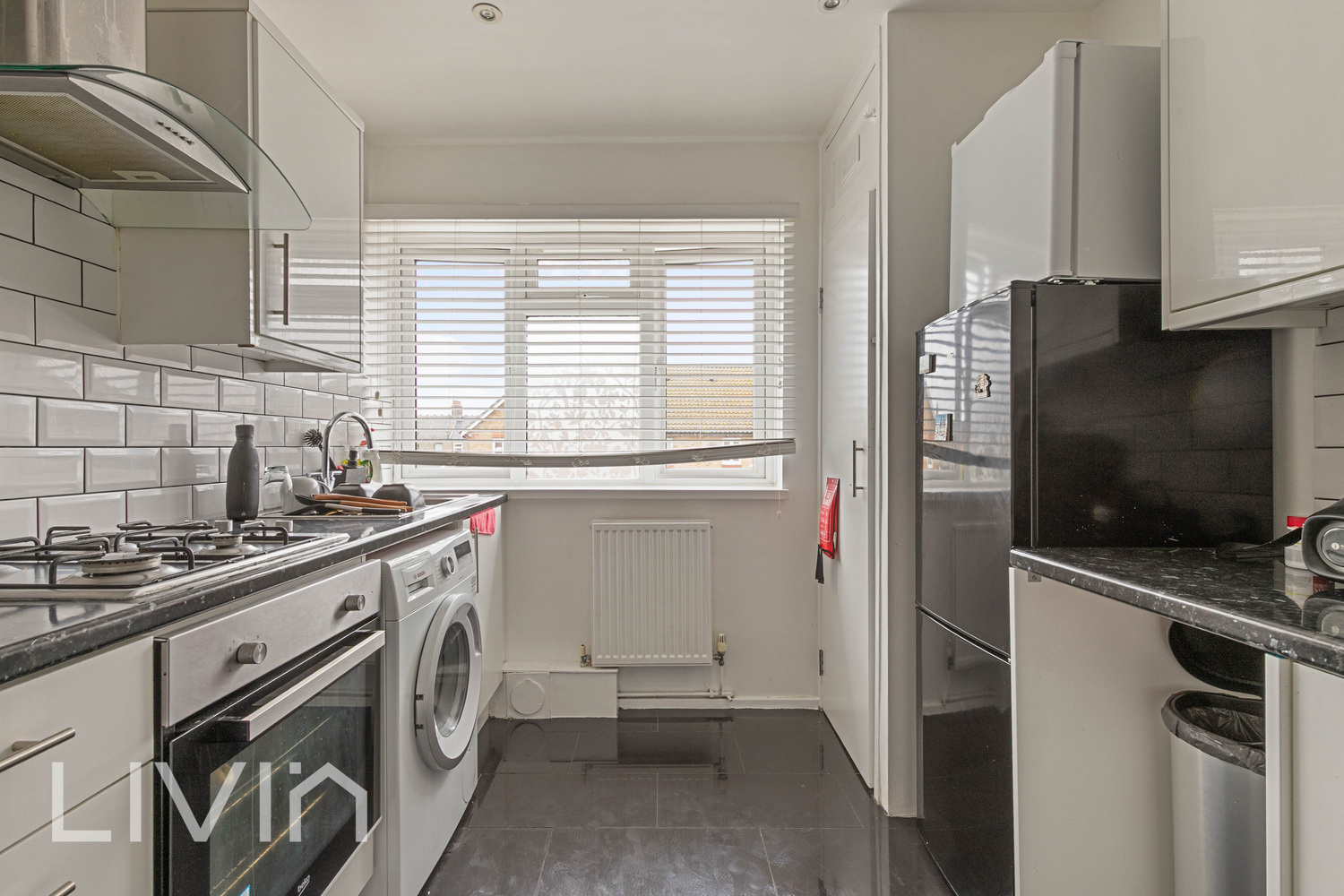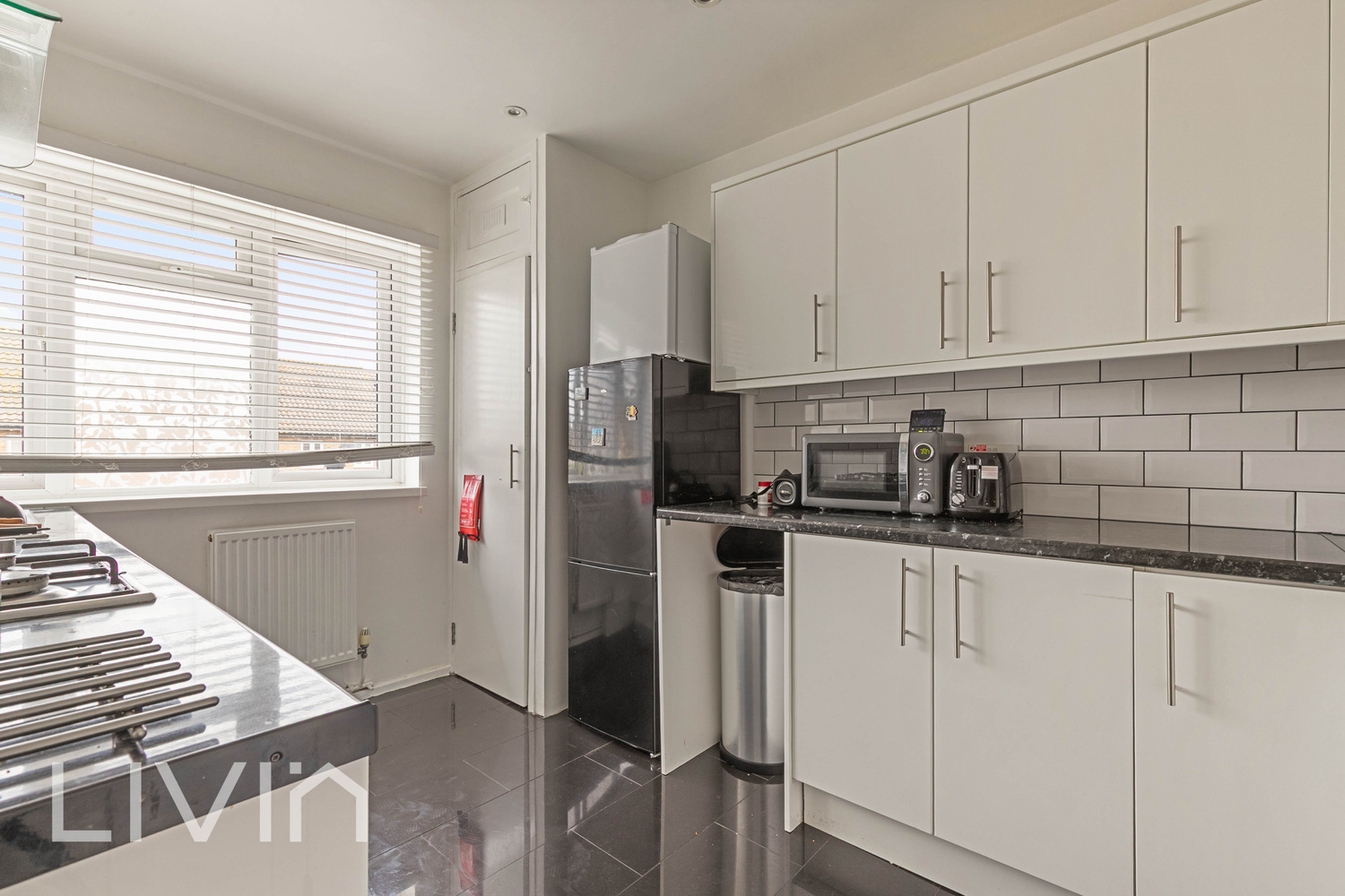 The kitchen is modern and functional, fitted with a range of white units, contrasting worktops, and tiled splashbacks. It offers plenty of storage and workspace, making it ideal for those who enjoy cooking, while the window allows for a bright and pleasant atmosphere.