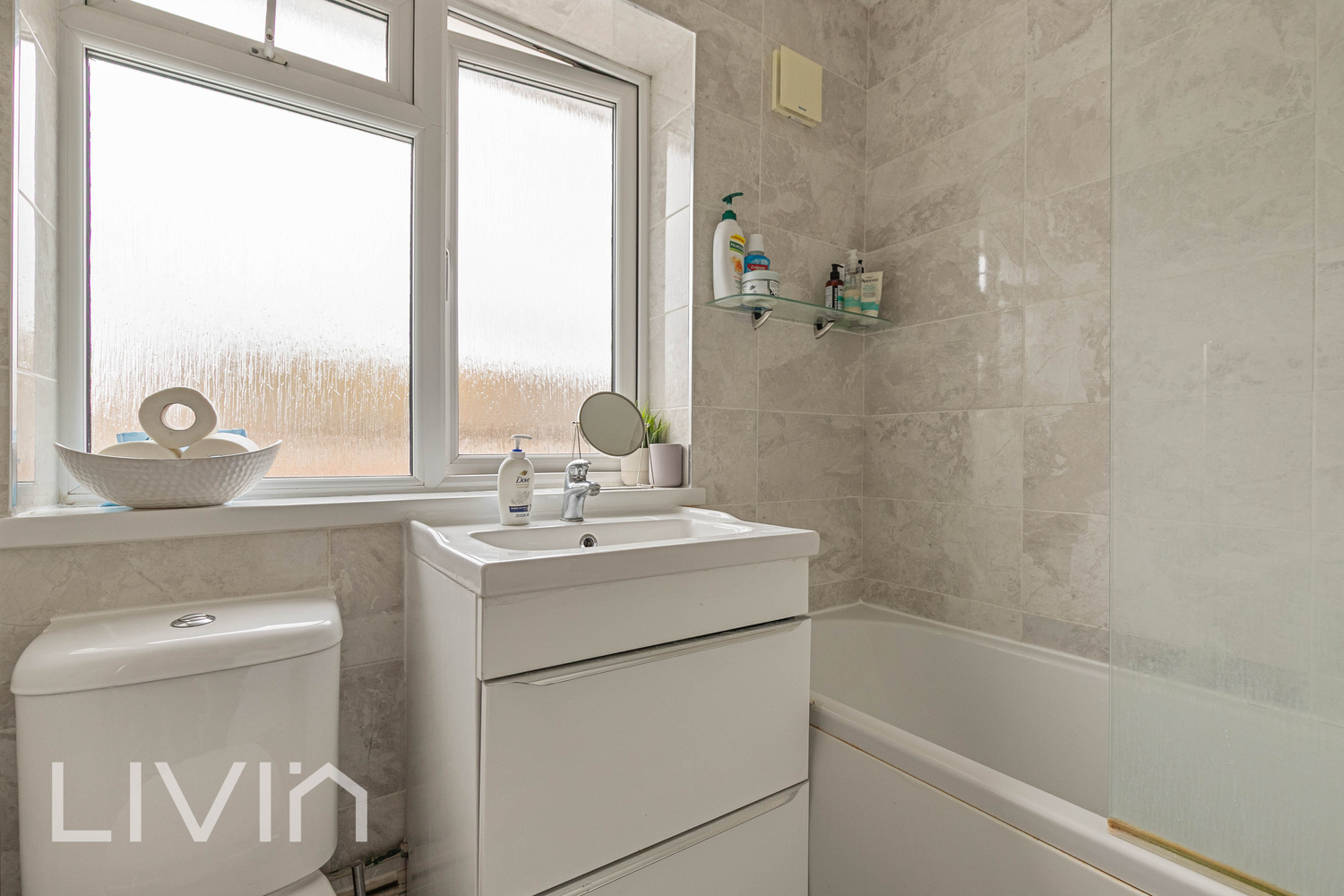 Both bedrooms are well-proportioned doubles. The principal bedroom is particularly spacious and enjoys a peaceful outlook, while the second bedroom provides flexibility for use as a guest room, home office, or nursery. The bathroom has been finished in a clean, contemporary style, featuring a bath with overhead shower, modern tiling, and a vanity unit.