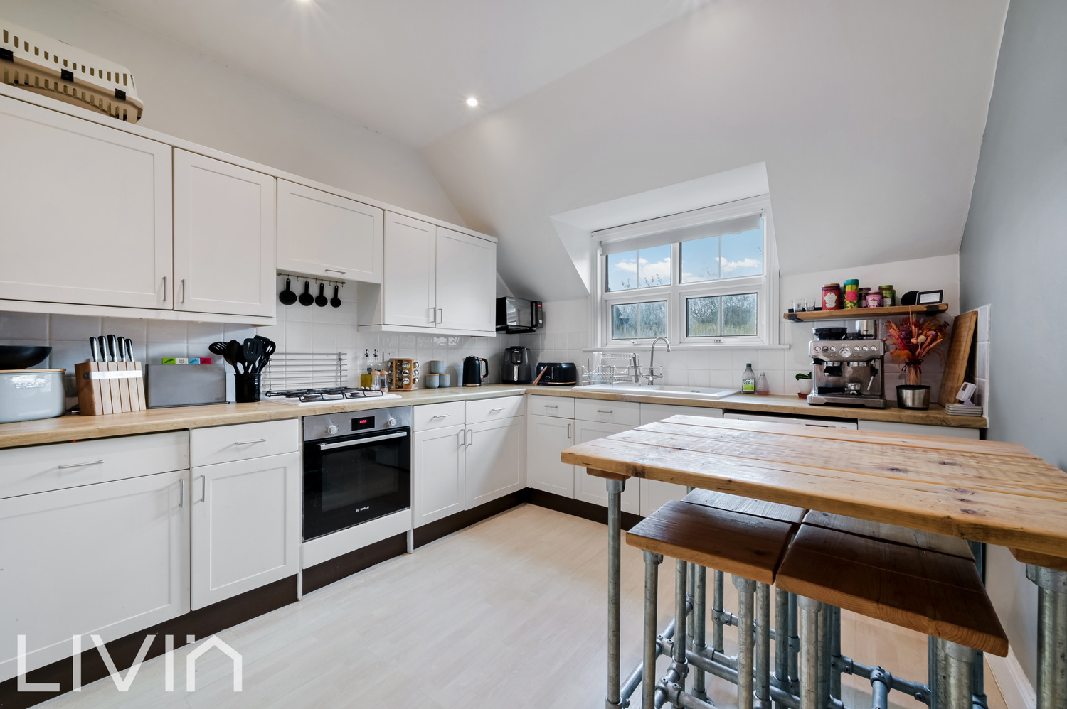 To the rear you’ll find a superb kitchen, fitted with contemporary white cabinetry, wood-effect worktops and integrated appliances, with plenty of room for a dining table. The family bathroom is a real highlight, finished in a fresh, modern style with white metro tiling and offering both a freestanding bath and separate walk-in shower, creating a calm, spa-like feel.