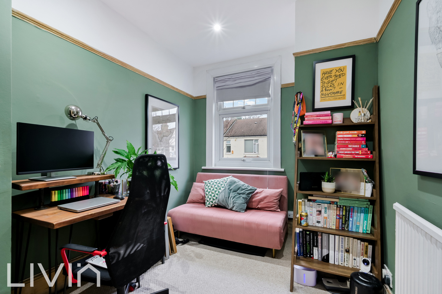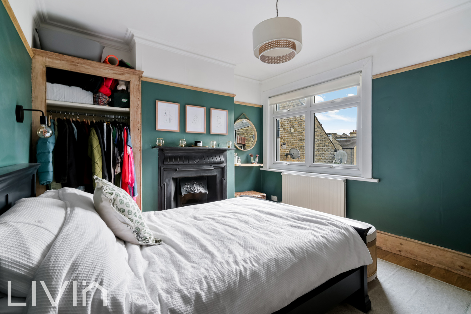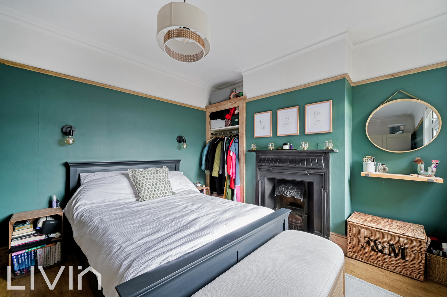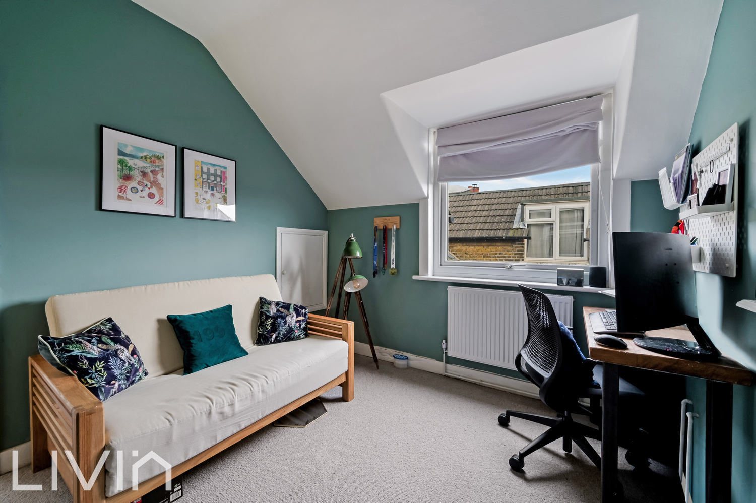 There are three well-proportioned bedrooms arranged across the first and second floors. The principal bedroom enjoys a lovely green feature wall, another original-style fireplace and an open wardrobe area that works perfectly as a dressing nook. A further double bedroom is currently set up as a home office and guest room, ideal for hybrid working, while the top-floor bedroom feels wonderfully tucked away and could make a cosy guest room, nursery or additional study.