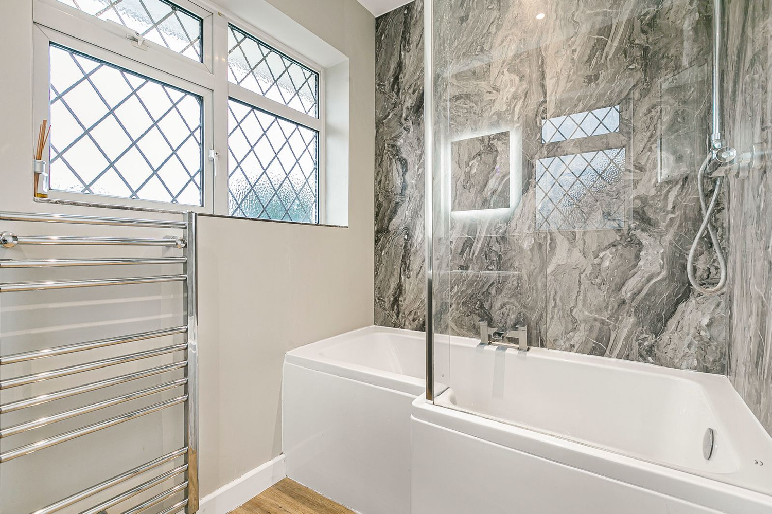 Upstairs, the three bedrooms are all of a good size and have been finished in neutral tones. The bathroom features a contemporary suite with a sleek illuminated mirror and chrome towel radiator.