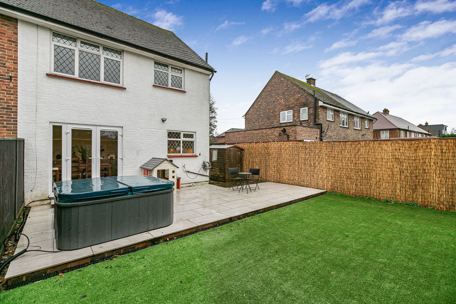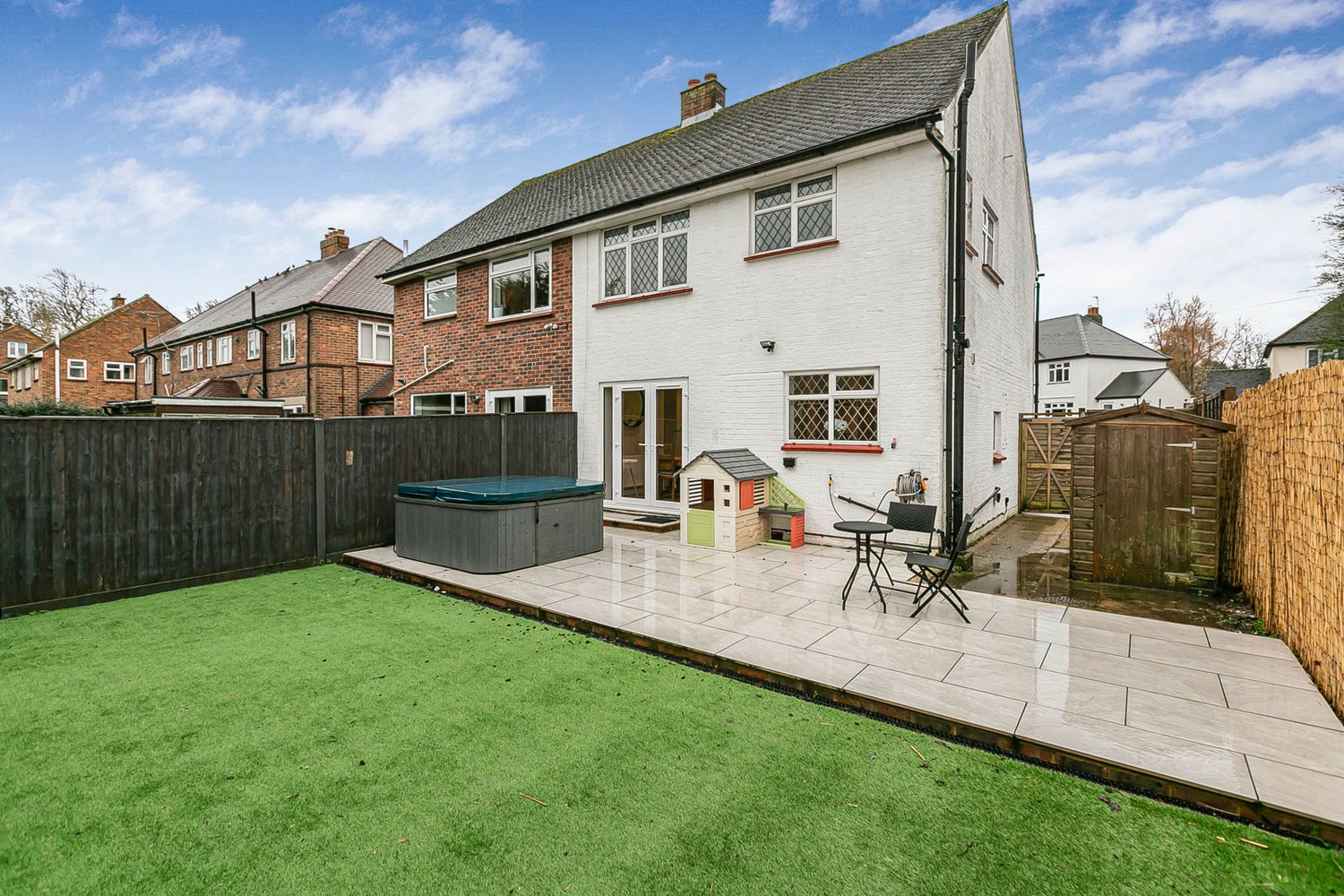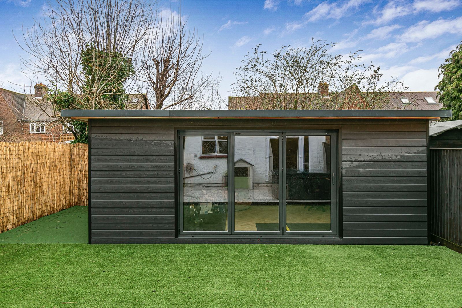 Outside, the rear garden has been landscaped for low maintenance with a porcelain‑tiled terrace, level artificial lawn and a timber‑clad garden room that can serve as a home office or games room. A hot tub on the patio provides an added touch of luxury.