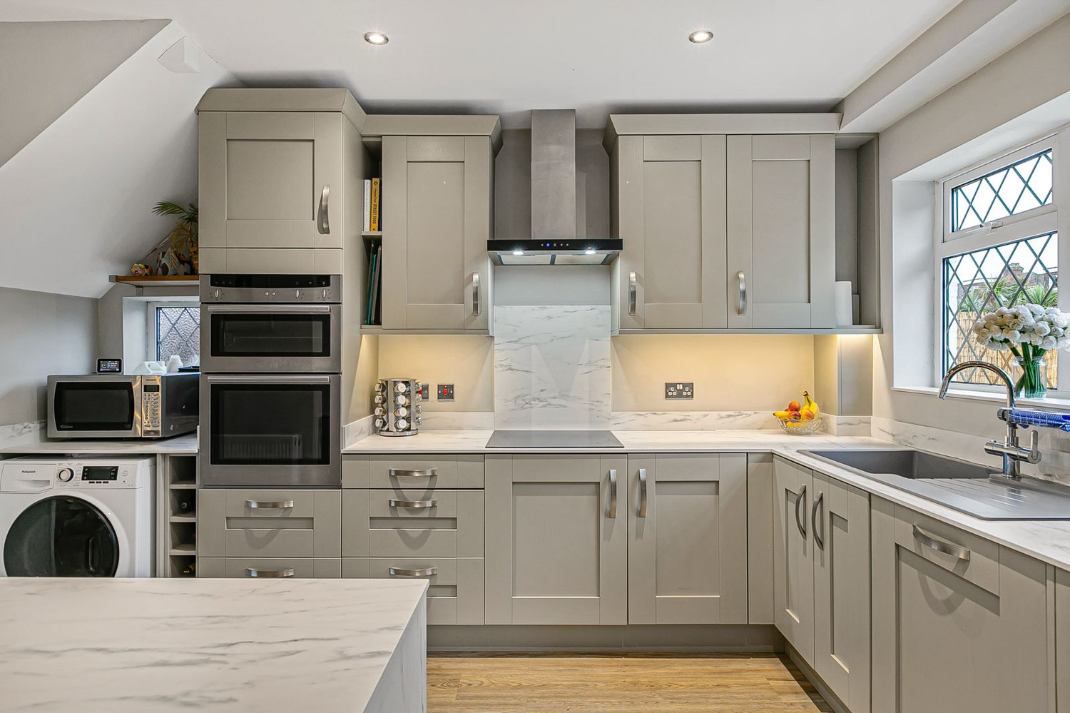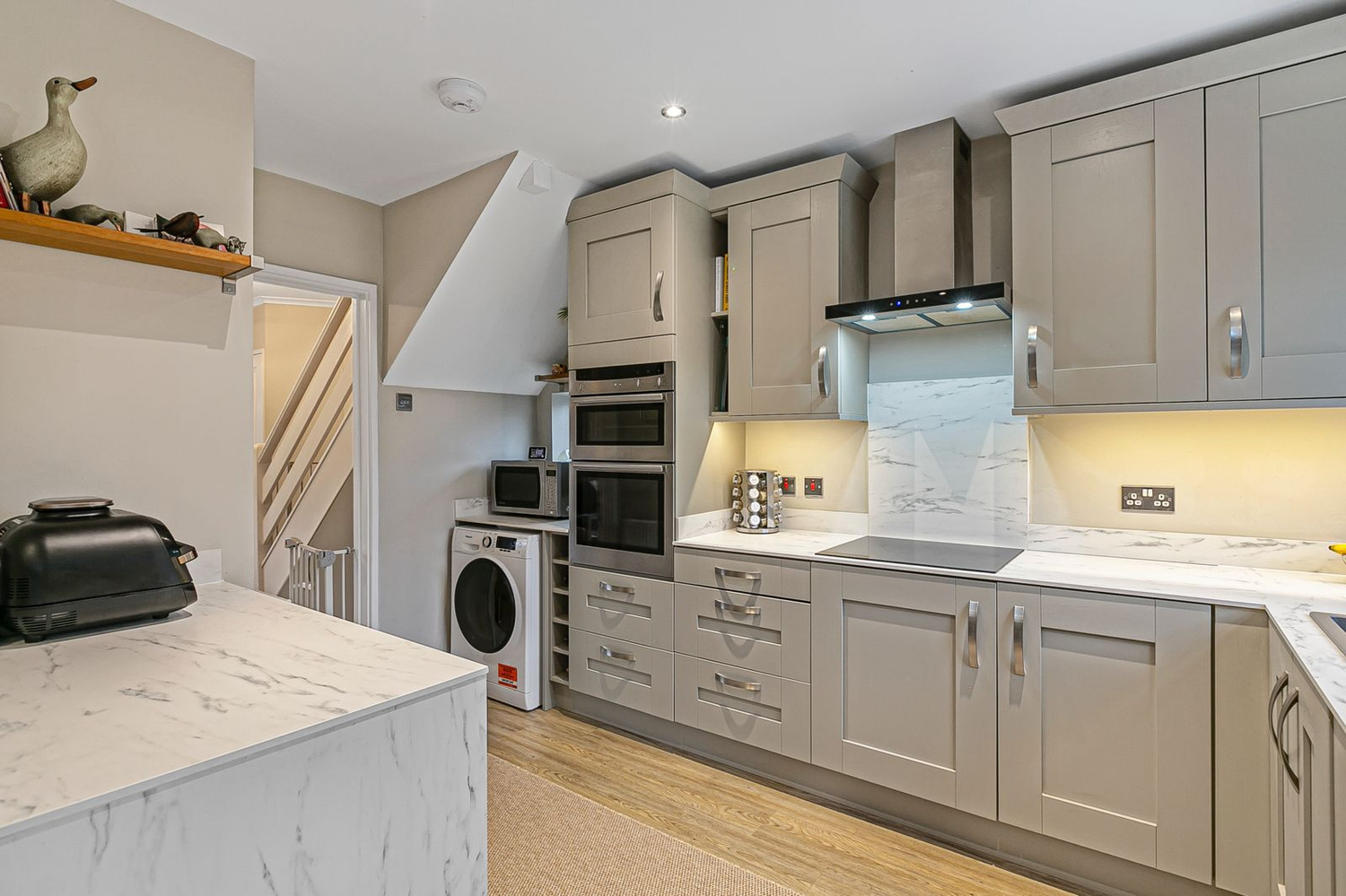 The entrance porch opens into a bright sitting room with a large leaded‑light window. At the rear, a superb open‑plan kitchen/dining room forms the heart of the house. Fitted with shaker‑style cabinetry, marble‑effect worktops and integrated appliances, the kitchen is designed for modern living. There is plenty of space for a dining table, and French doors connect the inside to the garden.