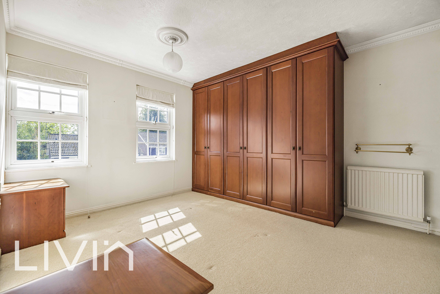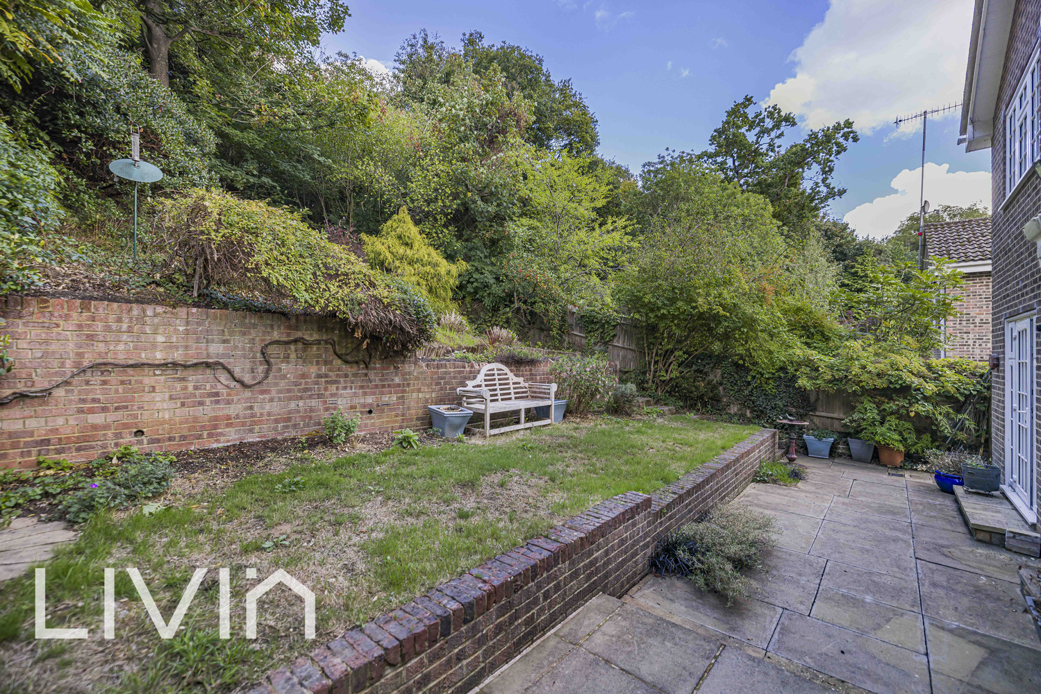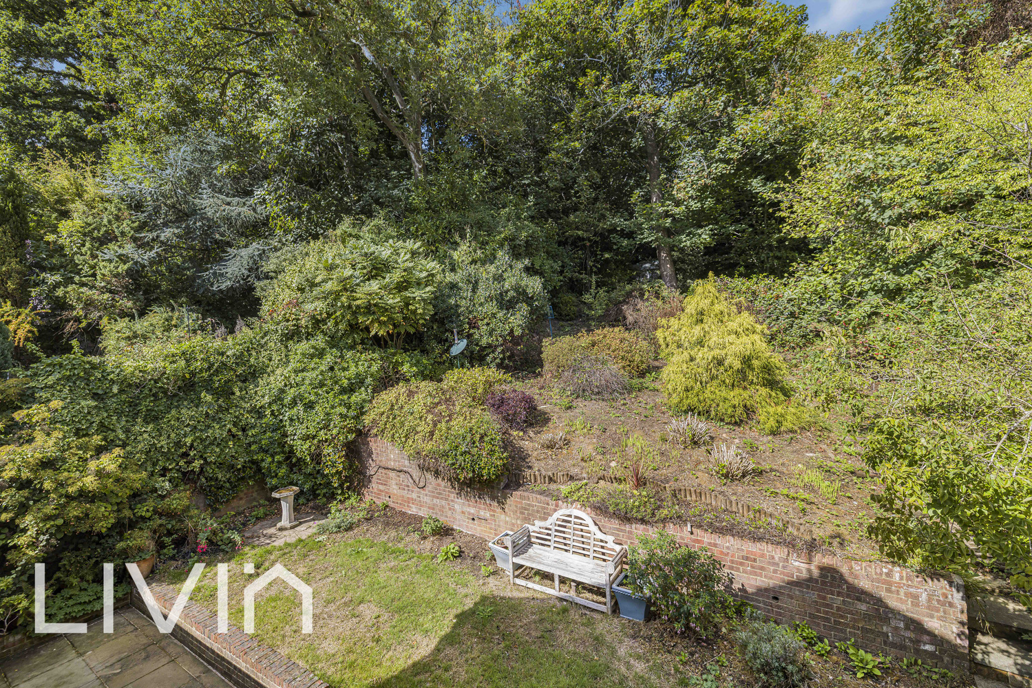 To the rear, the secluded garden is bordered by mature trees, offering a sense of privacy and a peaceful backdrop. There’s a mix of lawn, patio and tiered planting, ideal for relaxing or alfresco dining.