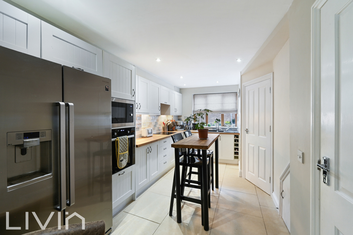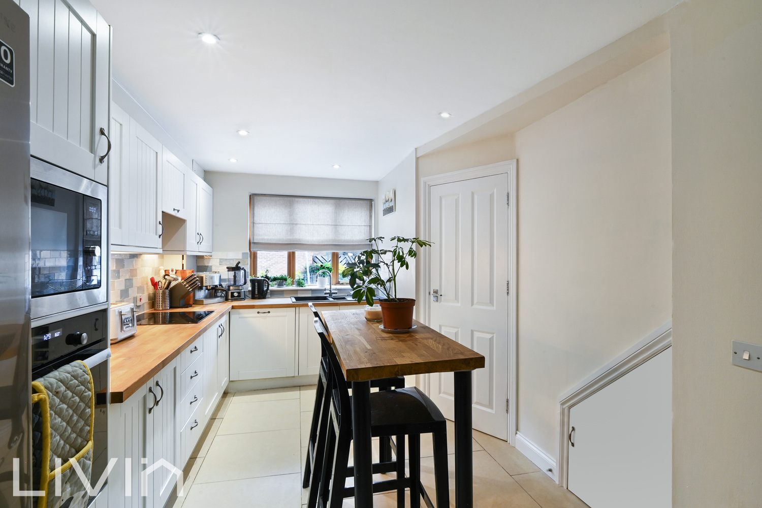 The ground floor welcomes you with a bright and stylish kitchen, fitted with a range of modern units, integrated appliances and ample worktop space, complemented by a central breakfast bar. To the rear, a generous living room provides a warm and inviting space to relax or entertain, with direct access via sliding doors to a private terrace—perfect for enjoying outdoor dining or a morning coffee.