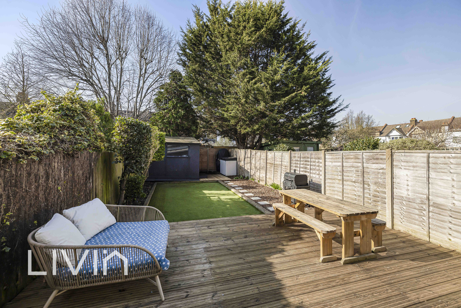 Outside, the rear garden is a real highlight – a generous, low-maintenance space featuring a broad decked terrace for dining and entertaining, a lawned area ideal for play, and a useful shed for storage. Whether you’re hosting friends, enjoying summer evenings or simply looking for more space, this garden delivers.