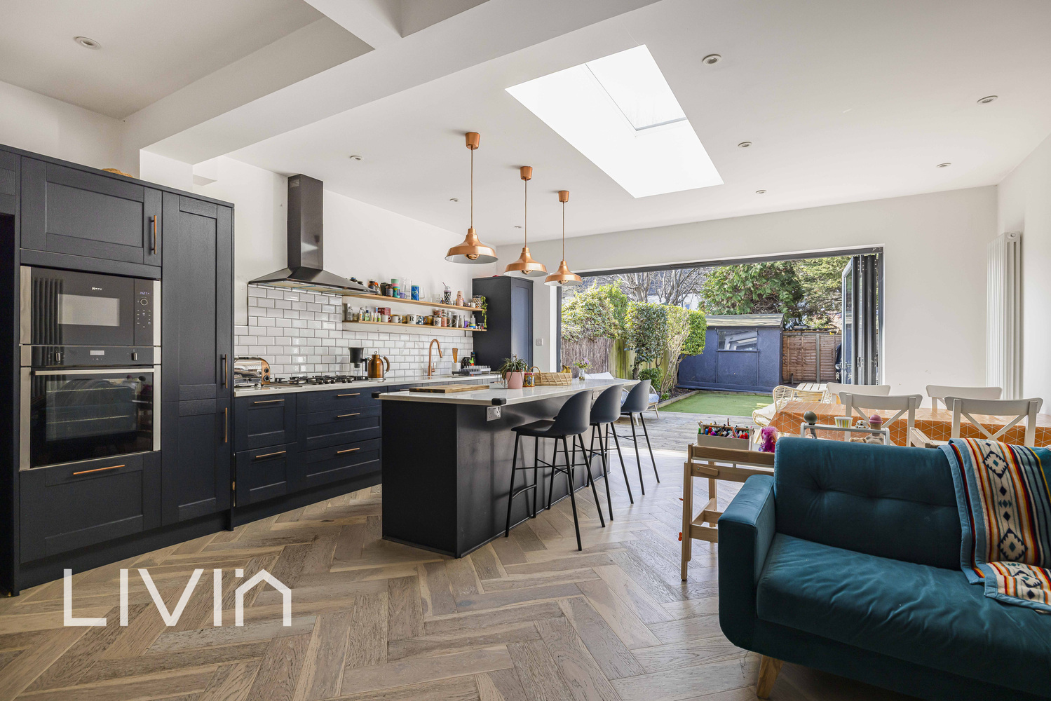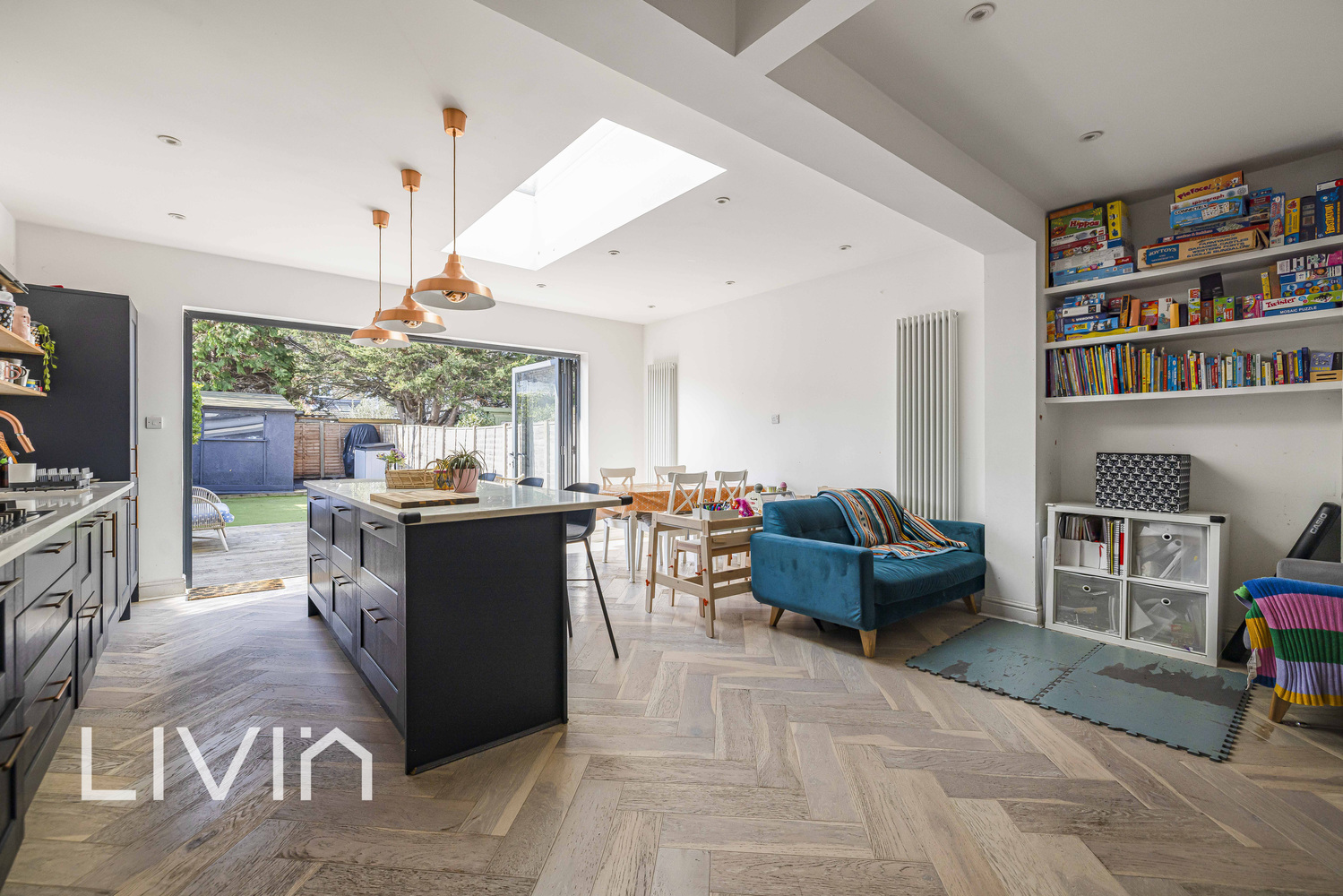 To the front, a welcoming reception room provides a cosy retreat, complete with an attractive feature fireplace and a wide bay window fitted with plantation shutters. The hallway leads through to the heart of the home: an impressive open-plan kitchen/dining/family space designed for modern living and entertaining. The stylish kitchen is finished with sleek cabinetry, quality worktops and ample storage, centred around a substantial island with breakfast bar seating. A large rooflight floods the room with daylight, while expansive bi-fold doors open seamlessly onto the garden, creating a fantastic indoor-outdoor flow. A practical pantry/utility area and a convenient ground-floor cloakroom add to the everyday functionality.